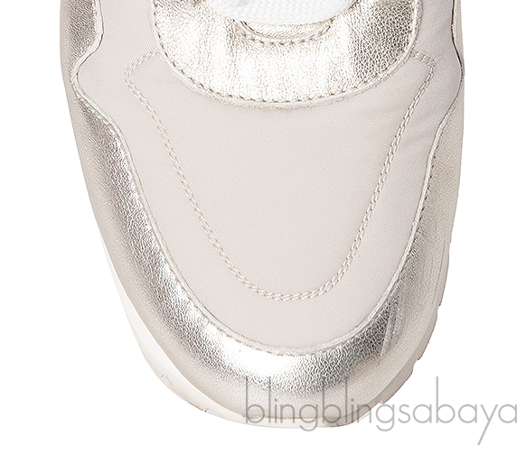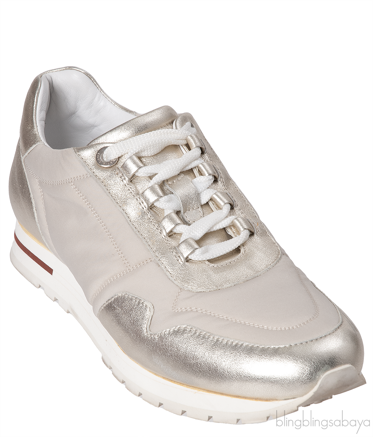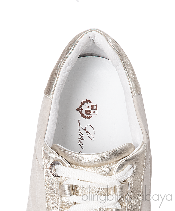 These stunning and sophisticated My Wind Microfibre & Leather Sneaker from Loro Piana are crafted from a microfibre treated with Storm System® for a waterproof, wind-resistant finish. This sneaker features a bi-color upper in metallic gold leather and white fabric and calfskin trim, the light palette is finished with a single Bordeaux line and the house\'s logo embossed to the heel.