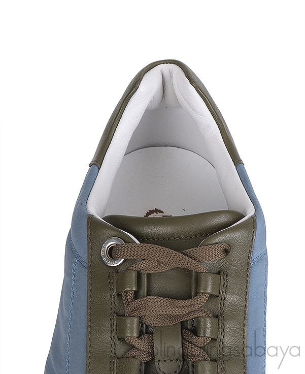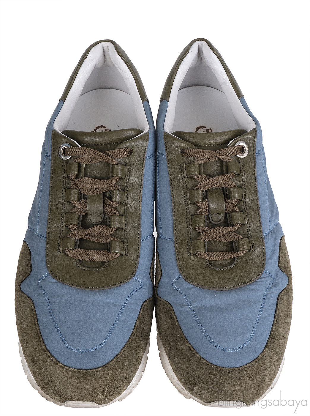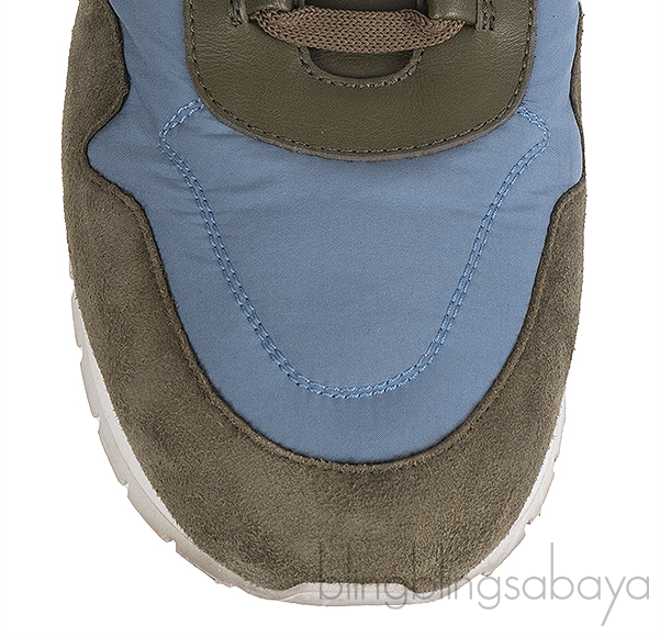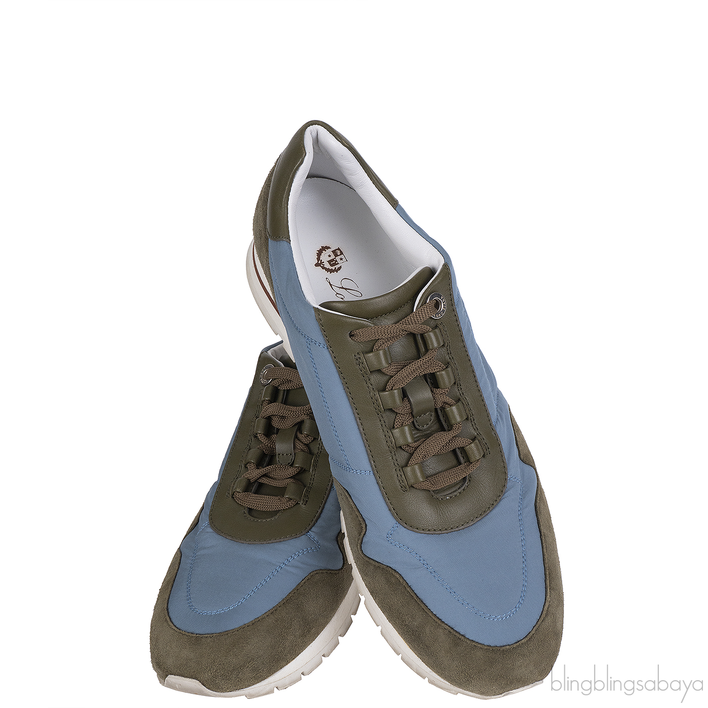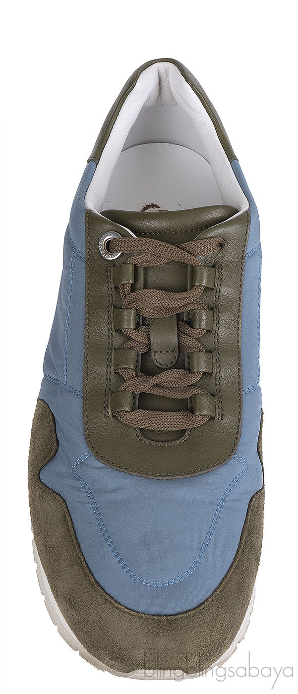 These stunning and sophisticated My Wind Microfibre & Suede Sneaker from Loro Piana are crafted from a microfibre treated with Storm System® for a waterproof, wind-resistant finish. This sneaker features a bi-color upper olive green suede, blue fabric and calfskin trim, the light palette is finished with a single Bordeaux line and the house's logo embossed to the heel.