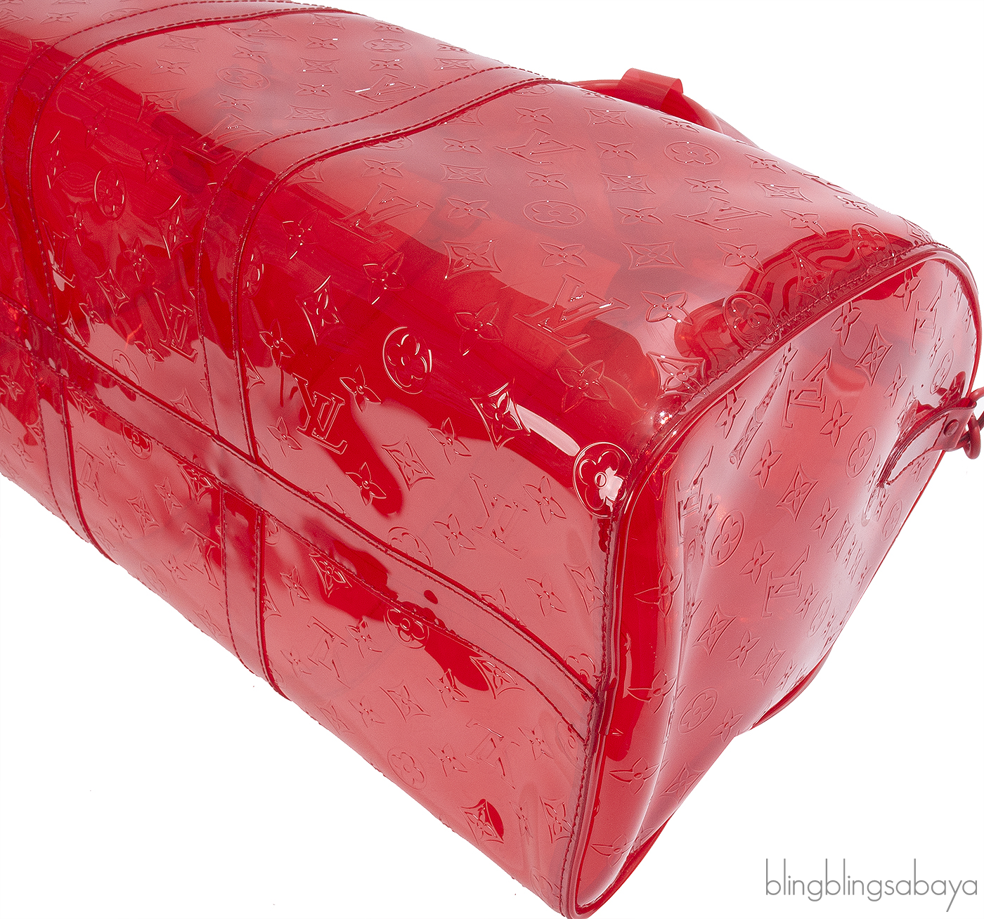 Well-known for its light weight, supple and always ready for immediate departure, this Keepal 50 PVC Bandouliere Red from Louis Vuitton is crafted from semi-translucent pvc red with debossed monogram pattern, This travelling bag features a two handles and a plastic chain strap, two-way zip fastening at top and has detachable adjustable shoulder strap.