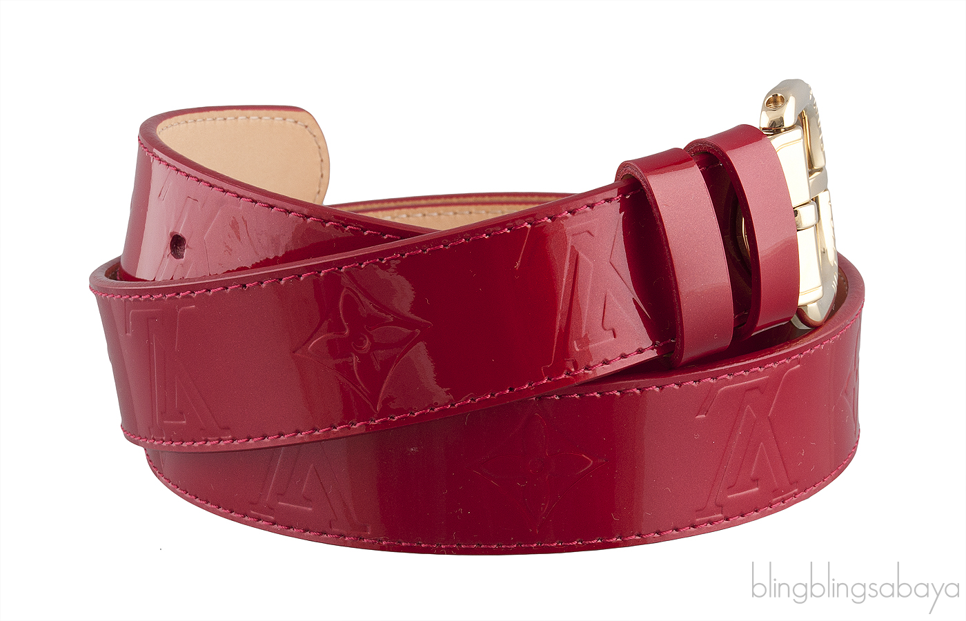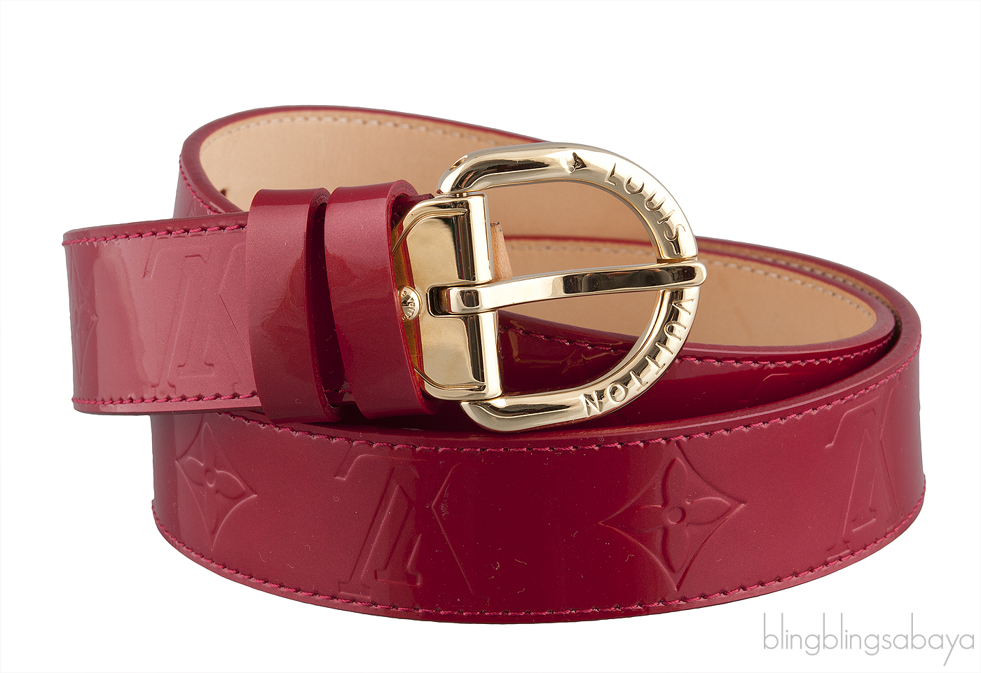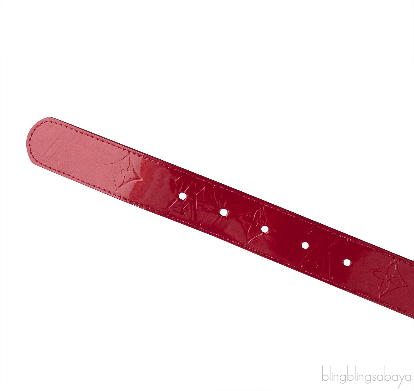 This Monogram Vernis Red Belt from Louis Vuitton is crafted from monogram vernis leather in red hue. This belt features a gold tone buckle with logo engraved, vanchetta leather lining and has 5 holes on the strap for size adjustment