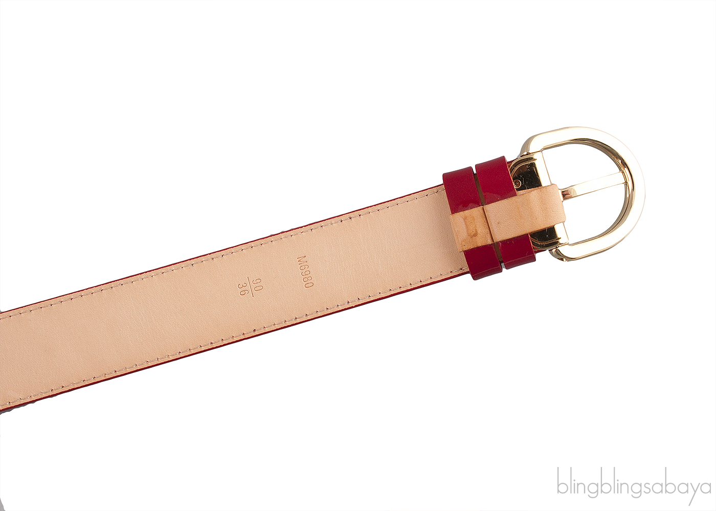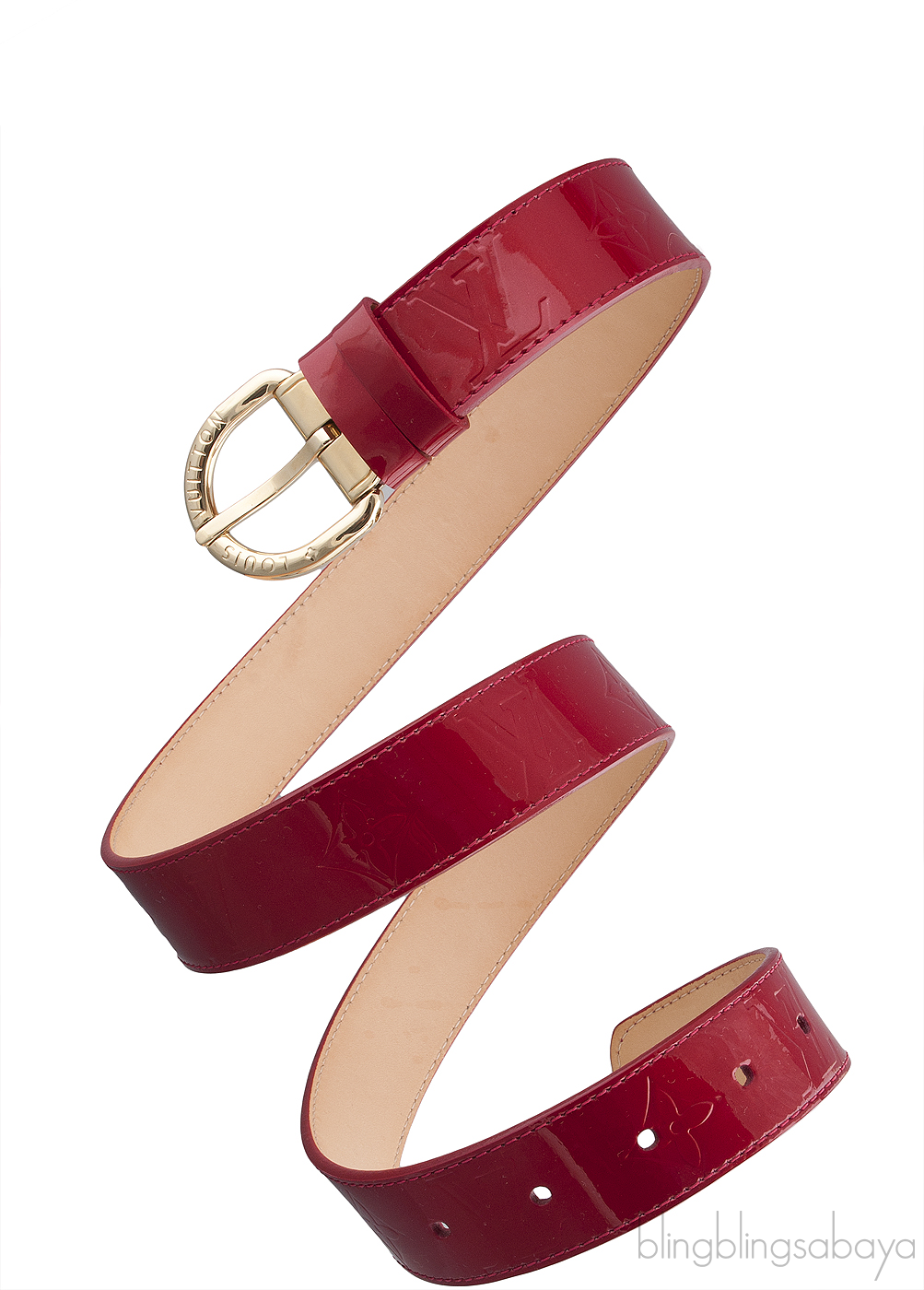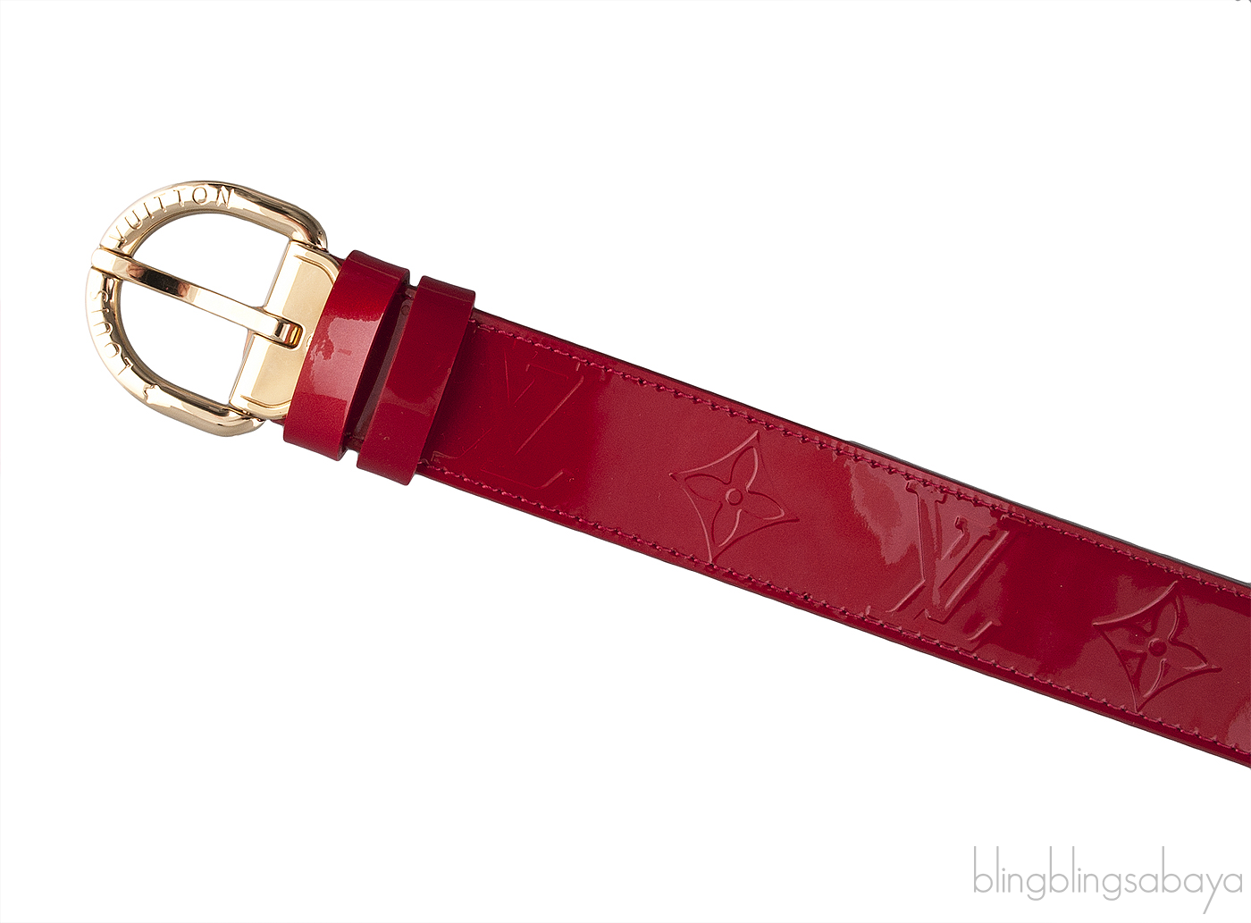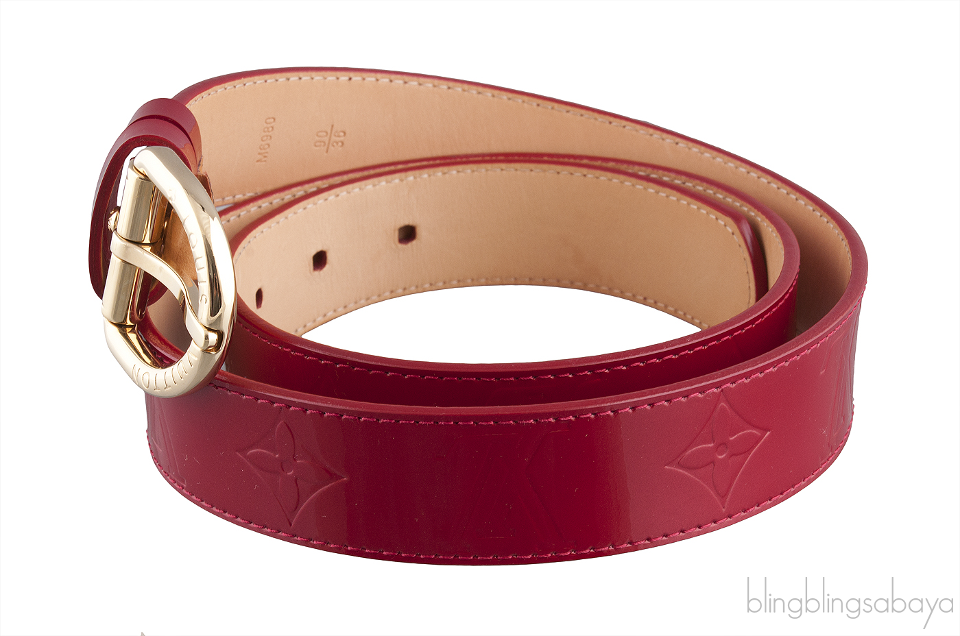 This Monogram Vernis Red Belt from Louis Vuitton is crafted from monogram vernis leather in red hue. This belt features a gold tone buckle with logo engraved, vanchetta leather lining and has 5 holes on the strap for size adjustment