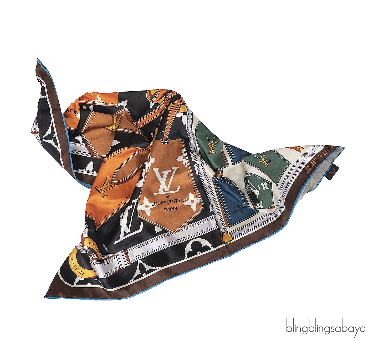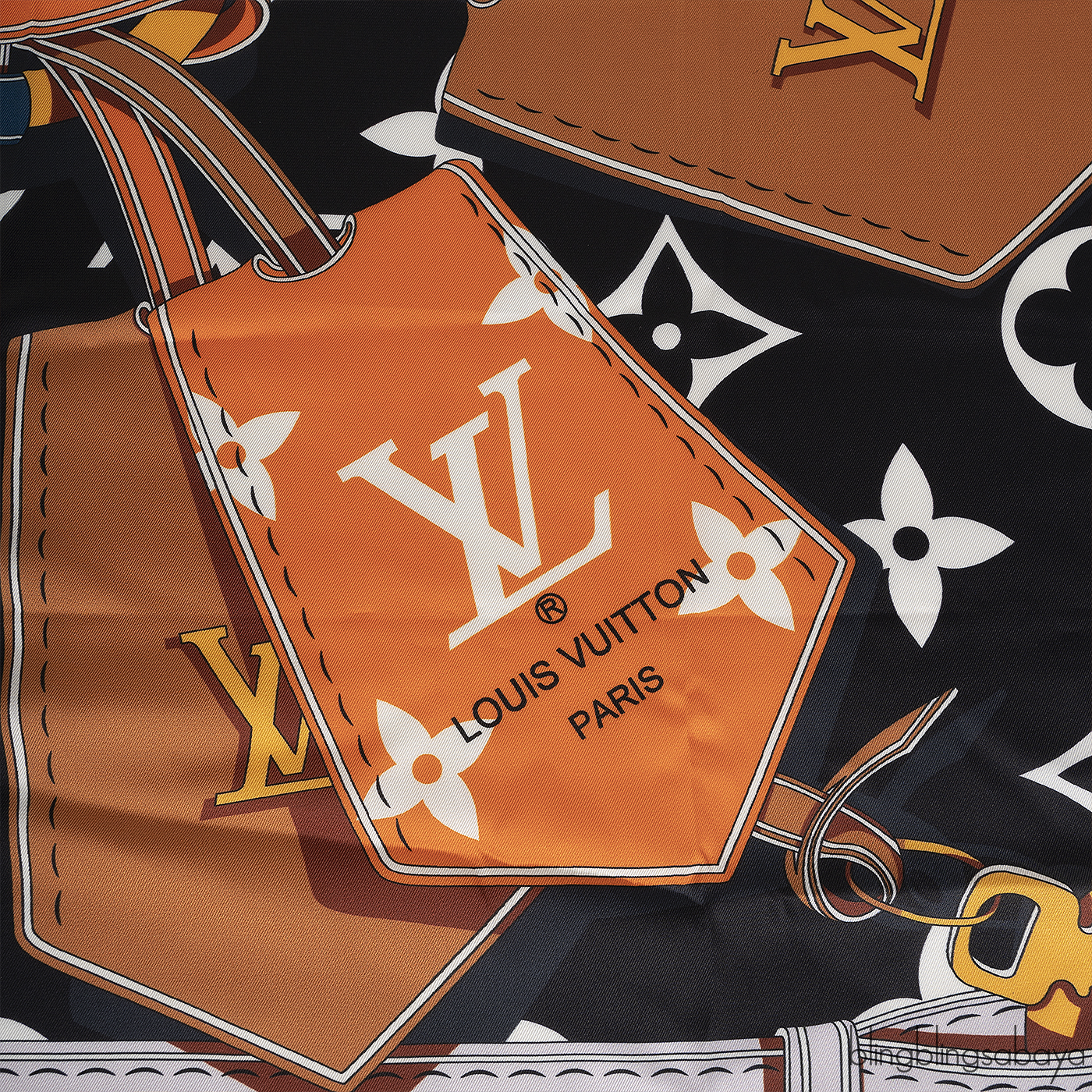 This Louis Vuiton Printed Scarf is crafted from 100% Silk fabric. This scarf features a multicolor luggage tag print motif, monogram print with a brown frame and rolled edges .