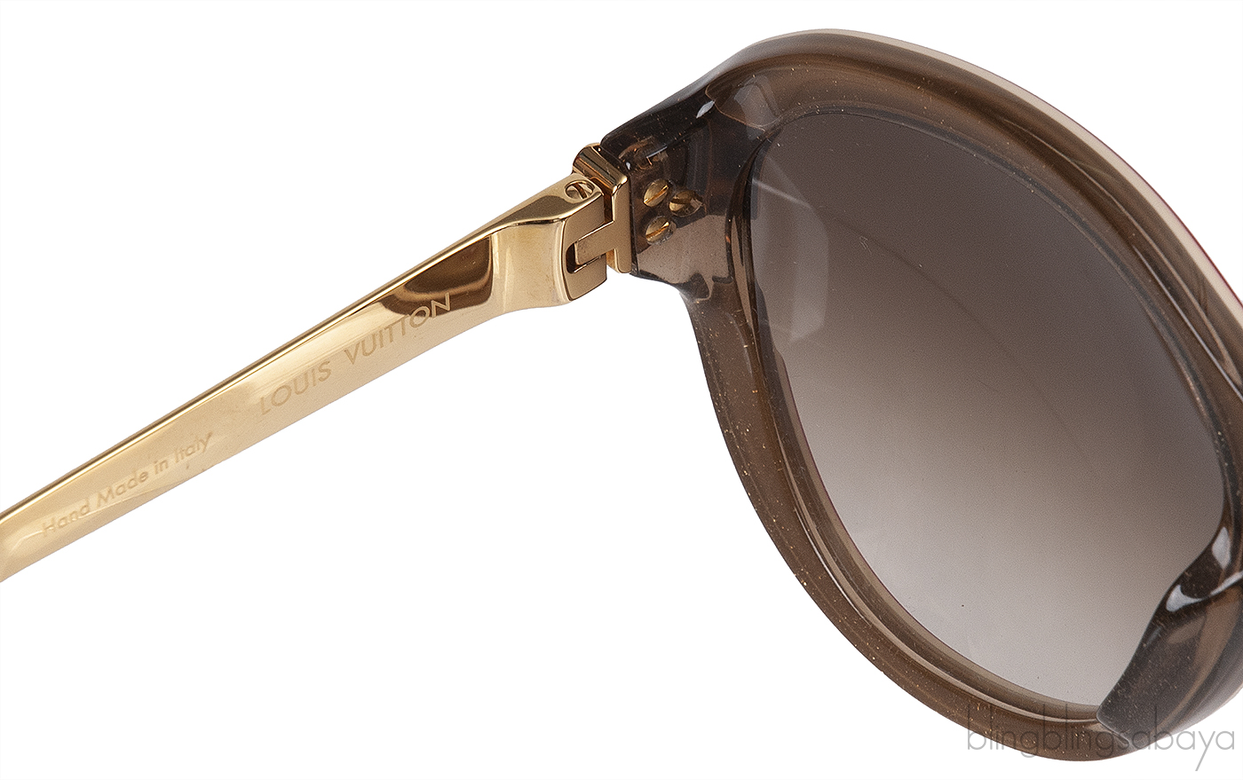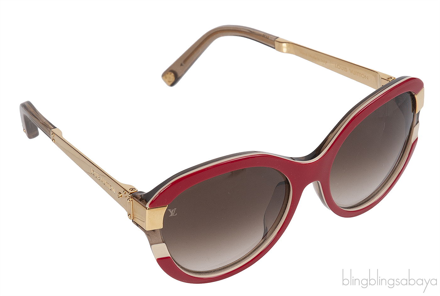 This Z0689E Soupon Cat-eye Sunglasses from Louis Vuitton features a three layered acetate frame in glittery brown, beige and red color. It has logo engraved in gold metal hands and gradient color effect lenses.