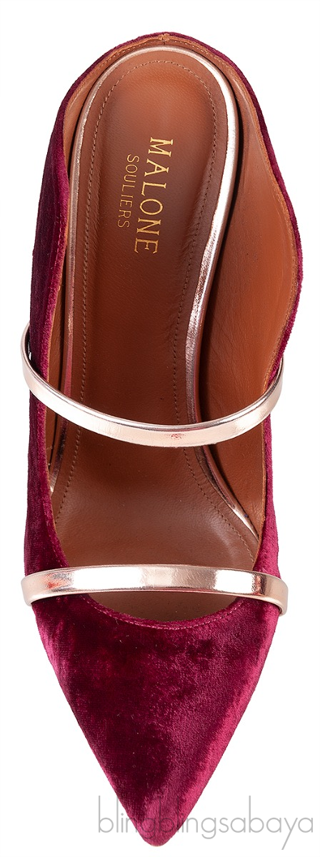 These Maureen 100 Velvet Heels from Malone are crafted from soft burgundy velvet fabric upper with rose gold leather lining. These heels features a pointed toe and high stiletto heels, slip-on style, leather sole and finished with metallic gold straps that sit across the foot.