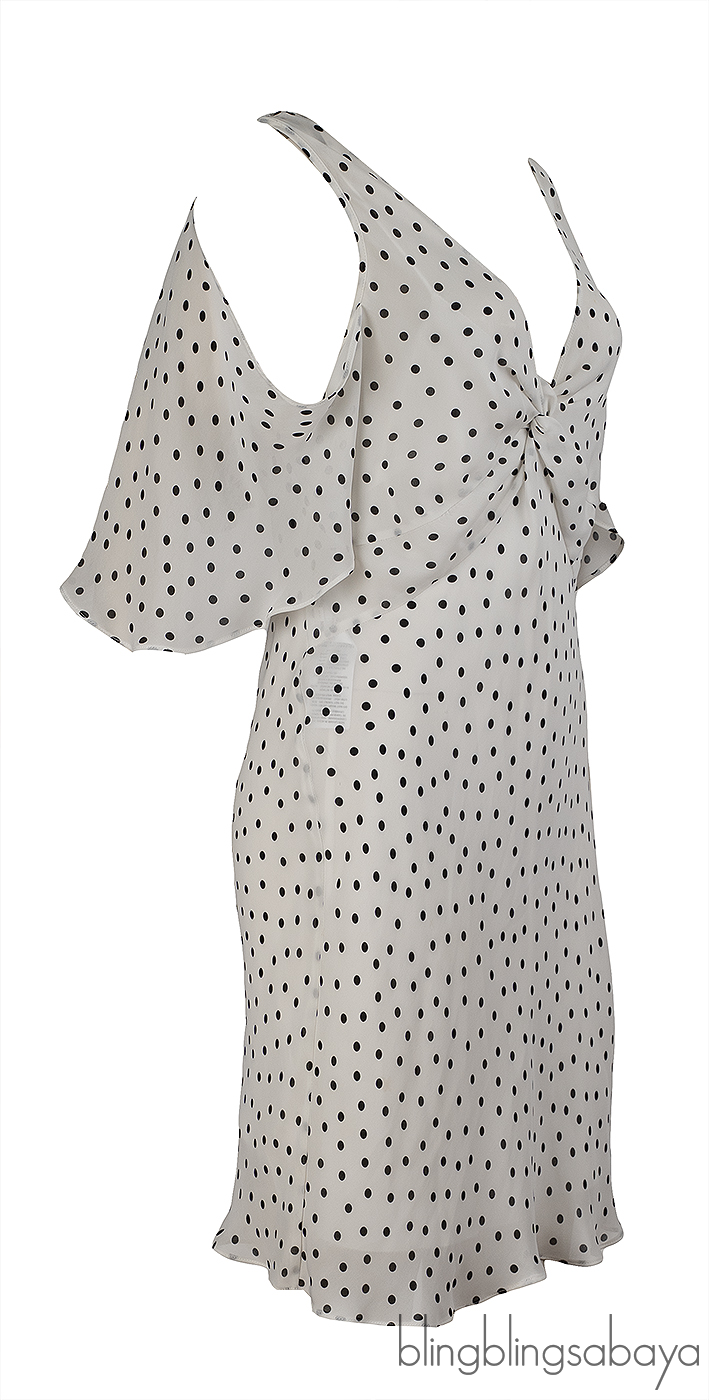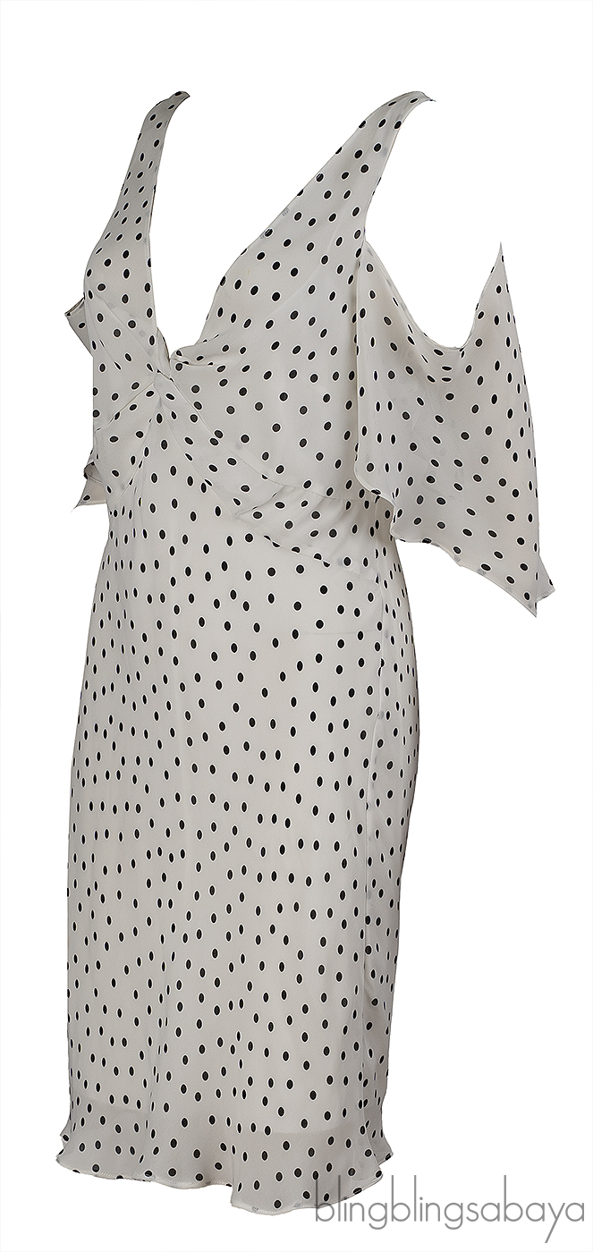 This McQ by Alexander McQueen polka-dot dress is crafted from 100% polyester in white with a contrasting black polka-dot pattern. It features a deep V-neckline, cut-out shoulders, and a flattering mini-length silhouette. The design is completed with an included inner dress for added coverage and comfort.