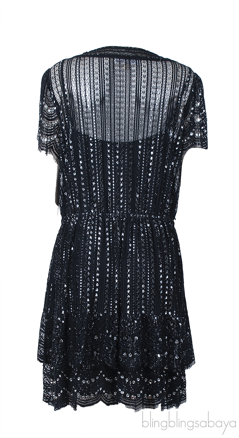 This Michael Kors Black Lame Studded Lace Dress is crafted from polyester and metallic threads. This dress features a slightly see-through studded lace overlay, scallop edges, short sleeves, split neckline and mini-length.