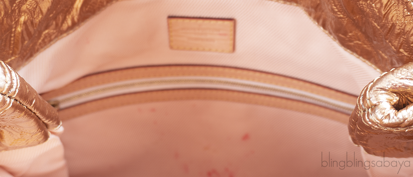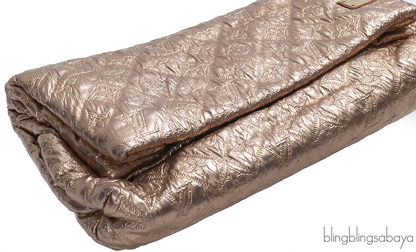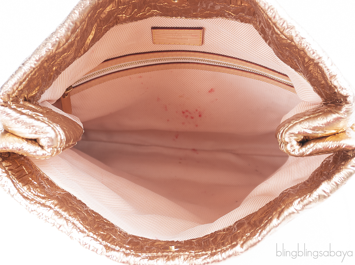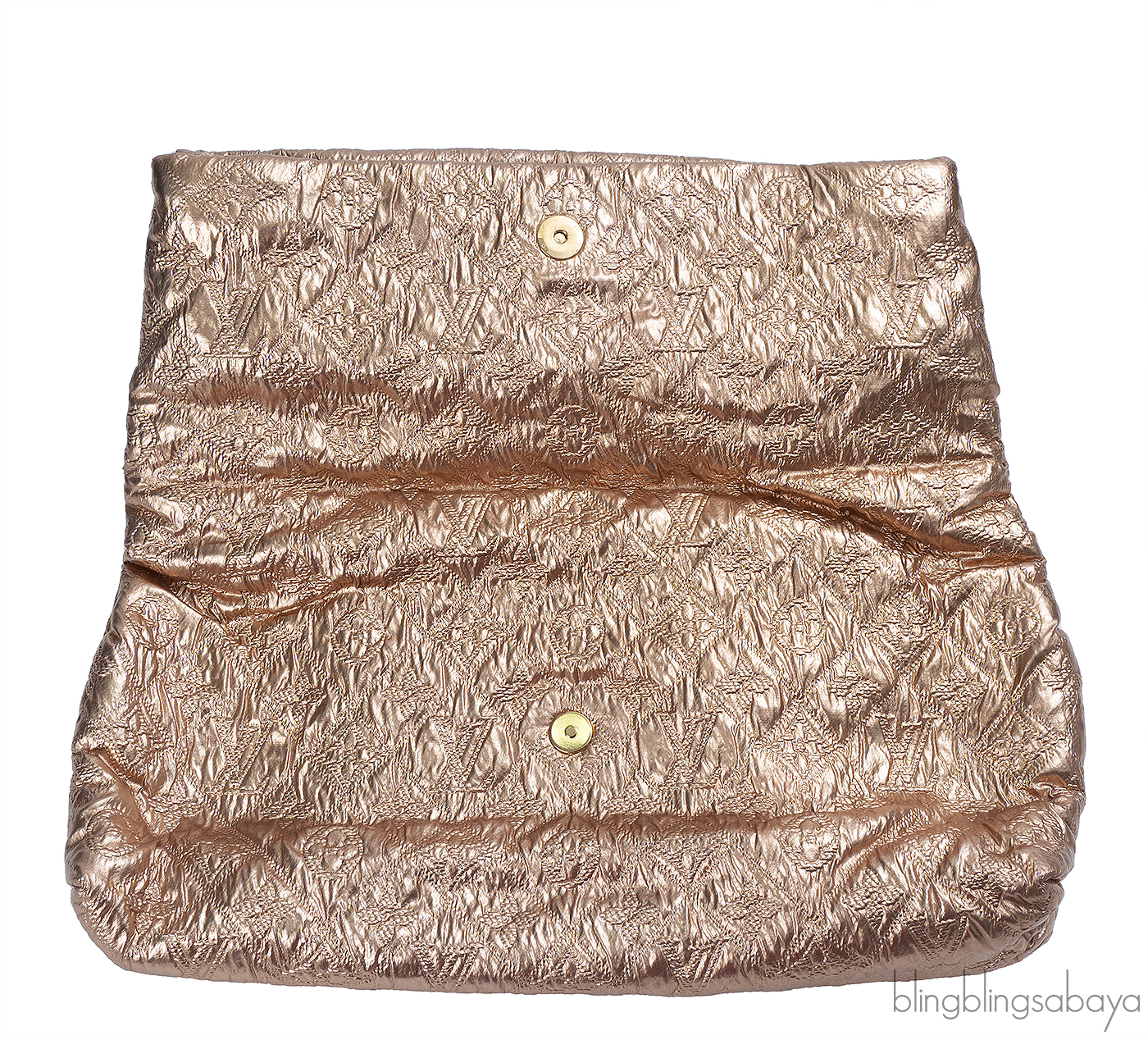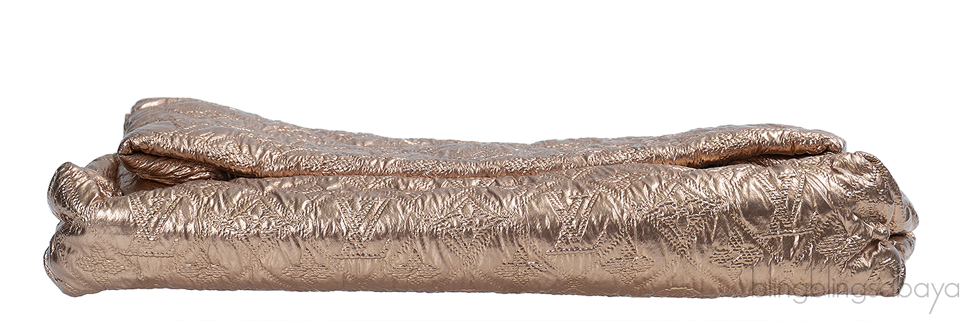This Monogram Lame Limelight Clutch from Louis Vuitton is crafted from rose gold metallic monogram coated canvas accented with the gold hardware. This clutch features a folded design with gold metal logo plate at front. Interior is fully lined with fabric and has one zip pocket inside.