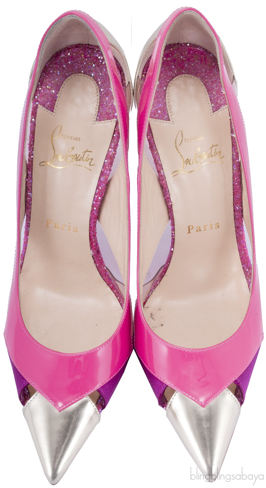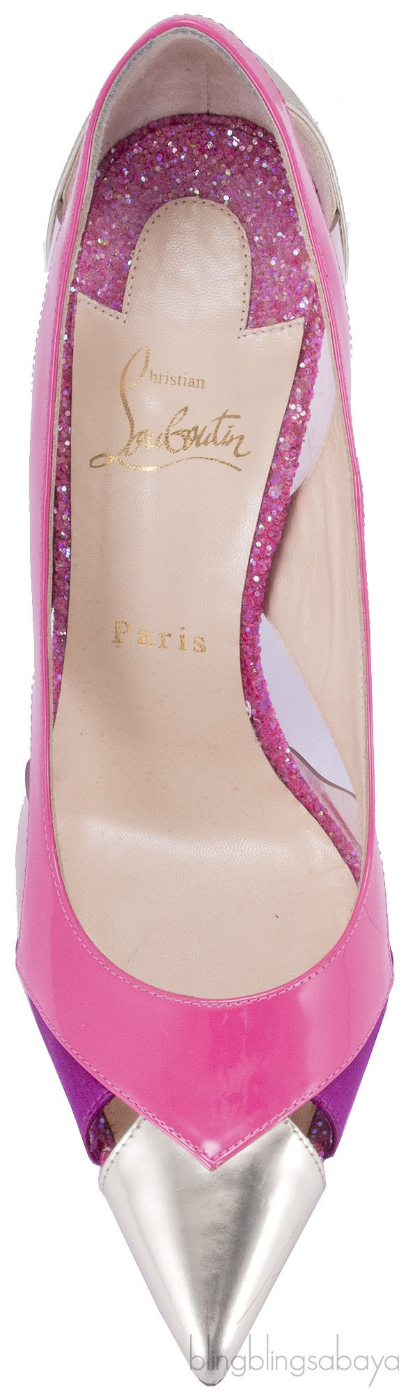 This Multicolor Galata 100 Pump from Christian Louboutin is crafted in multicolor leather and PVC. Featuring a pink, gold, purple leather and Pvc upper with cut out design, beige and pink glitteres insole, pointed toe and gold covered heels measuring 100 mm high.