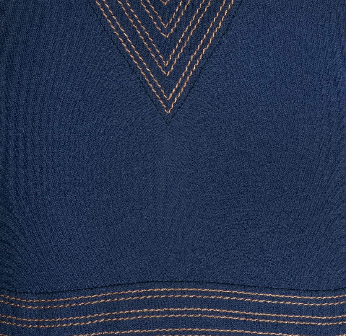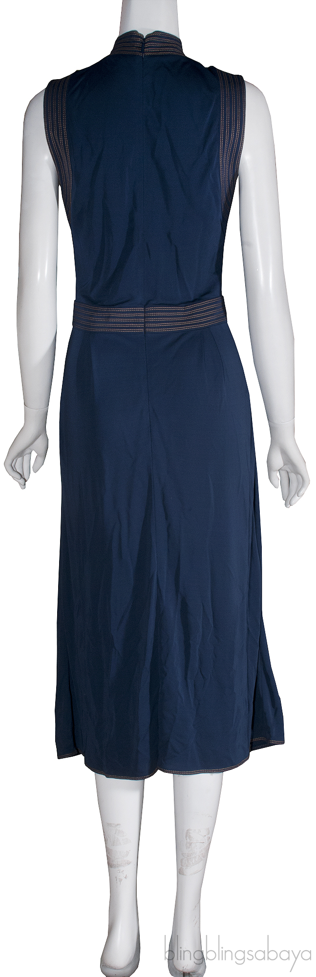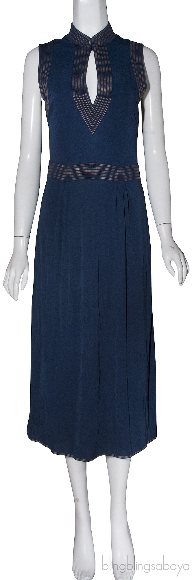 This Navy Blue Sleeveless Dress from Gucci is crafted in 100% Viscose with 100% Viscose Lining in Navy Blue color featuring a gold contrasting stitched design on the V-neckline, sleeveless trimming and on the waist line, slightly pleated mid-length skirt and zip fastening at rear.