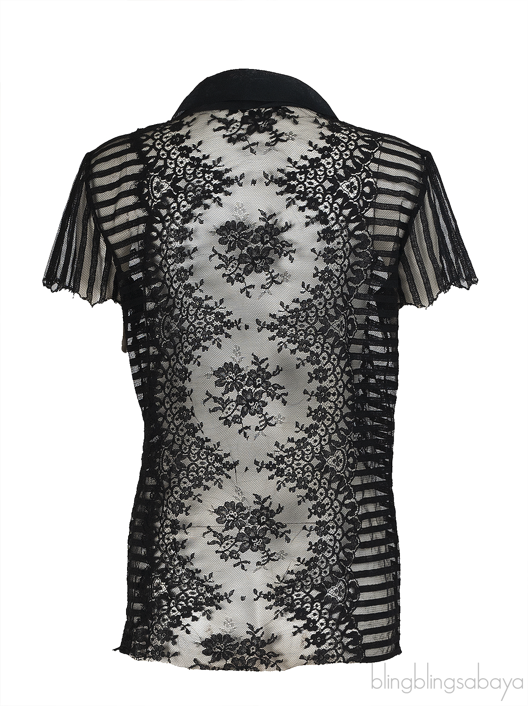This Oscar de la Renta black sheer blouse is crafted from 100% silk. Designed with a round neckline and self-tie ribbon, it features short sleeves, front button fastening, and delicate floral lace detailing at the front and back.
