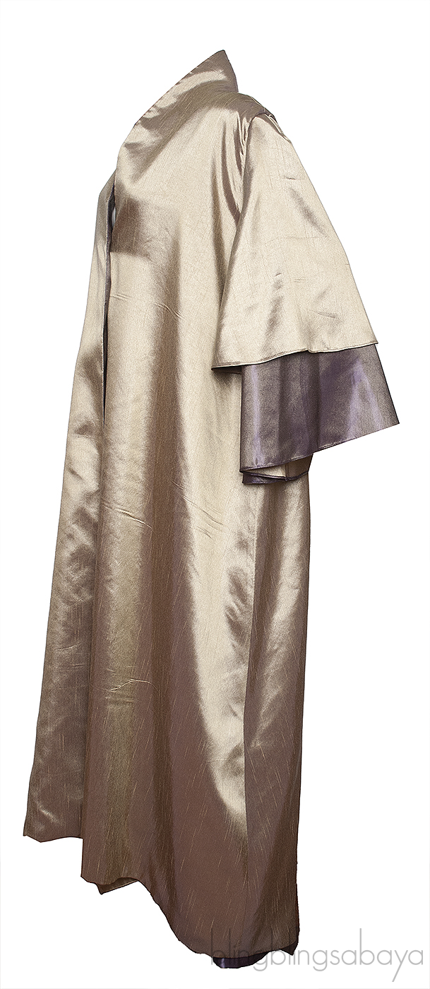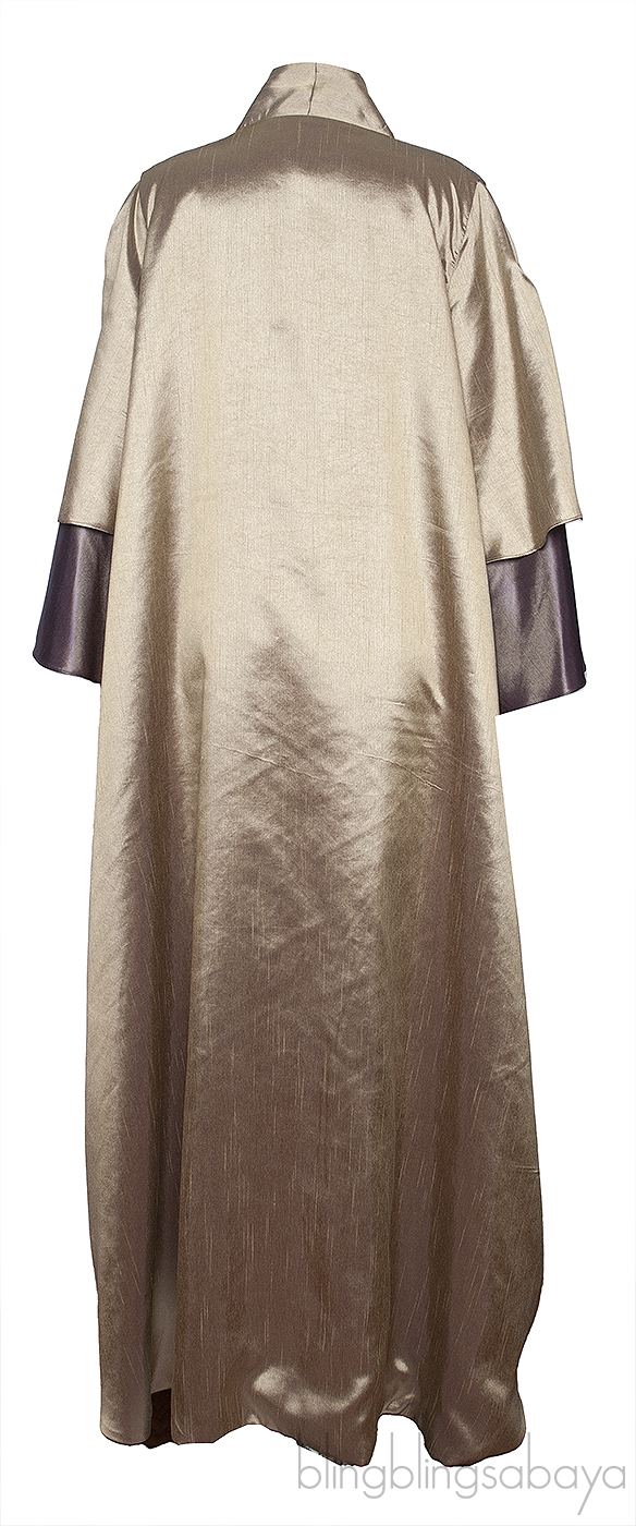This Rabelle Metallic Bi-color Kaftan Dress is crafted from metallic greenish gold and purple fabric. This kaftan features an open front, layered bell sleeves, open front and maxi length.