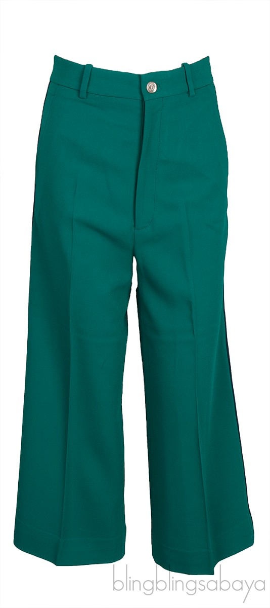 Green Wide Leg Trouser is crafted from 97% Viscose & 3% Elastane featuring a welt pocket design at back, zip fly and and button fastening at front,red & blue gross grain stripes on both sides and wide leg design.
