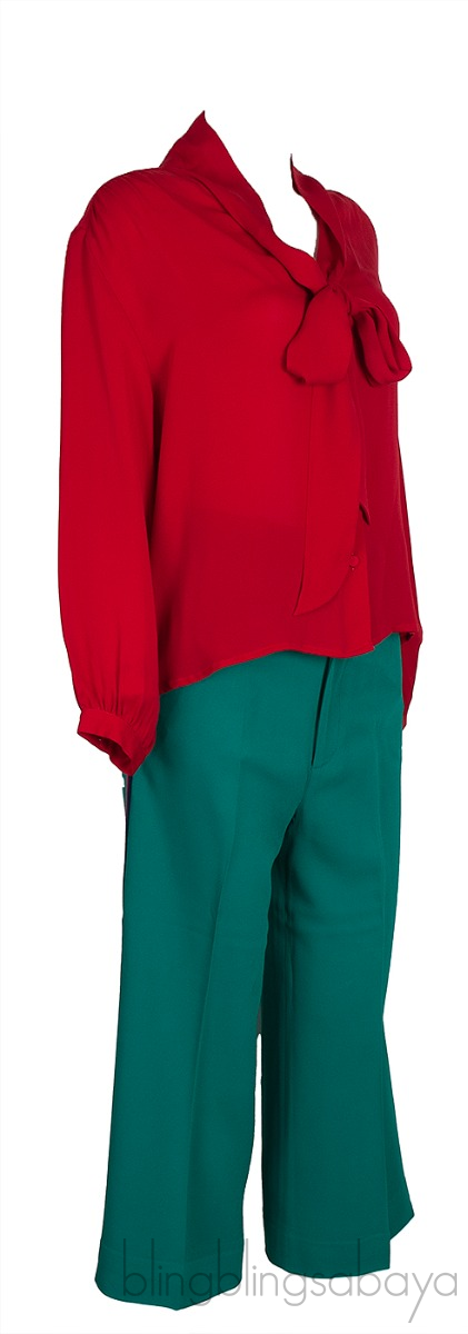Red Pussy Bow Longsleeve Blouse & Green Trouser