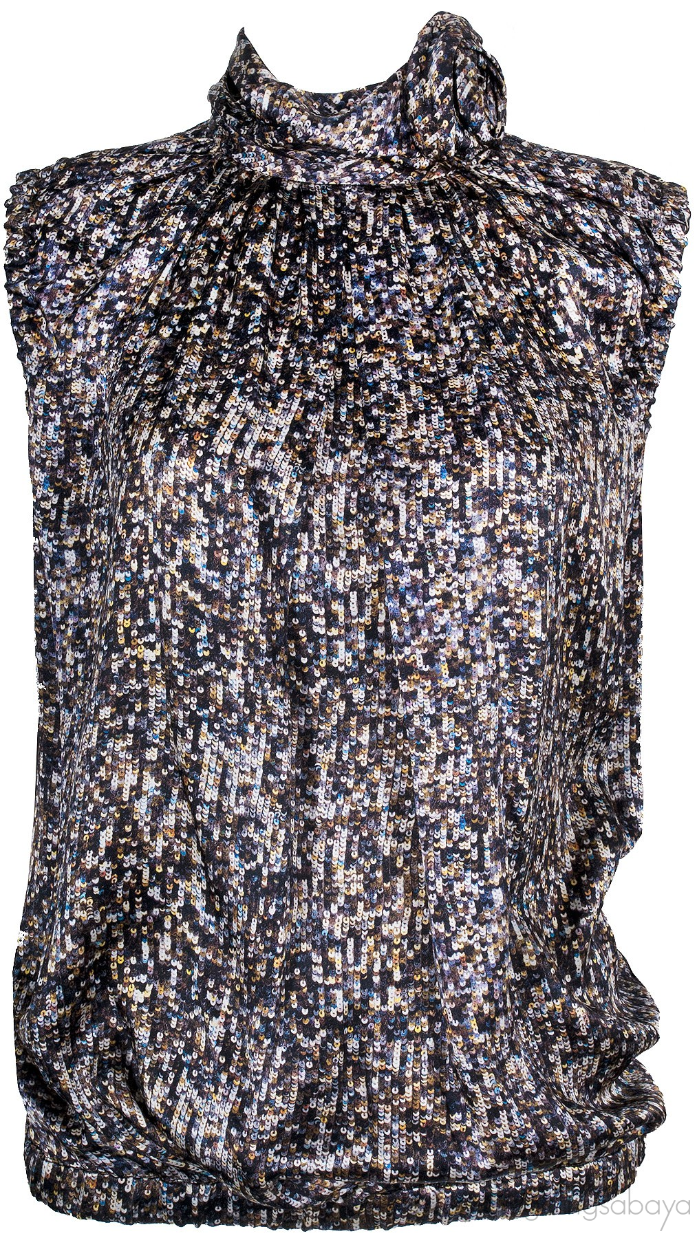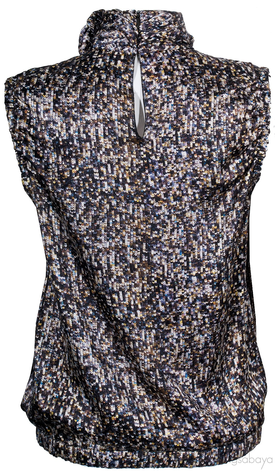 This Sequin Printed Sleeveless Top from Dolce & Gabbana is made of 100% Silk Fabric in multicolor sequin print featuring a close neckline, gathered front detailing at neck, sleeveless, elasticized hemline and has floral applique at neck.