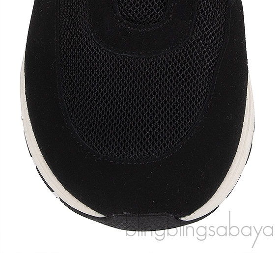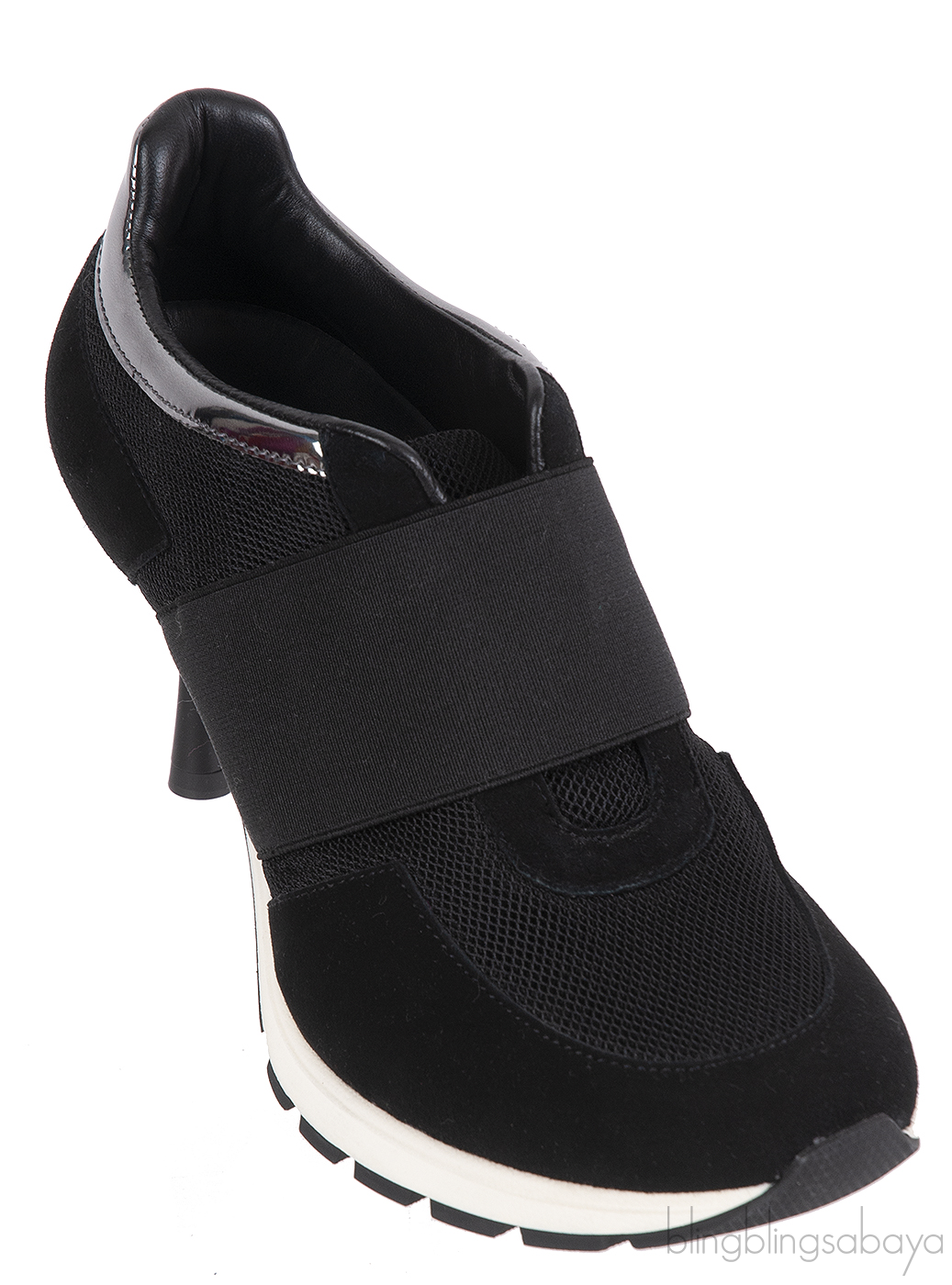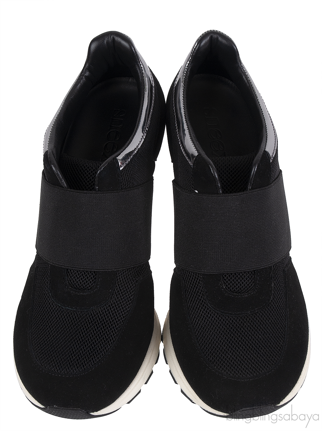 These Sneex The Icon Hy-heel Black Sneaker is crafted from suede leather, mesh fabric, black elastic strap and silver metallic leather accent. This hybrid heels features a wide elastic strap with slip-on construction that hugs the foot, leather lined insole, slip-on, rubber like sole and 78 mm heels. This shoes has a comfortable toe box and arch support designed for elegance and ease.