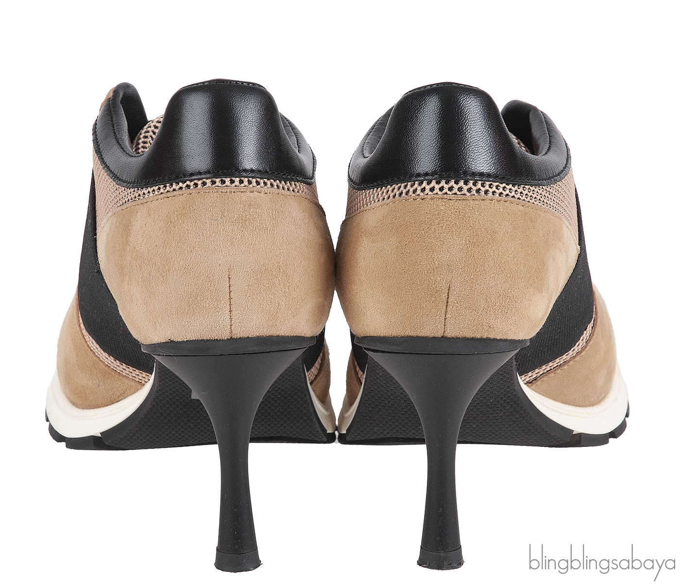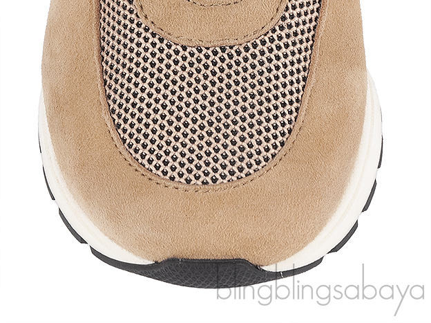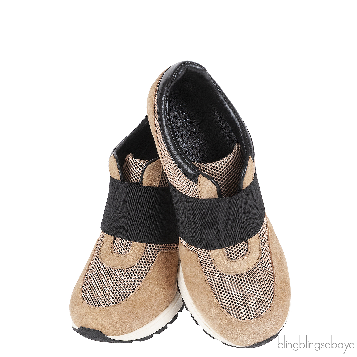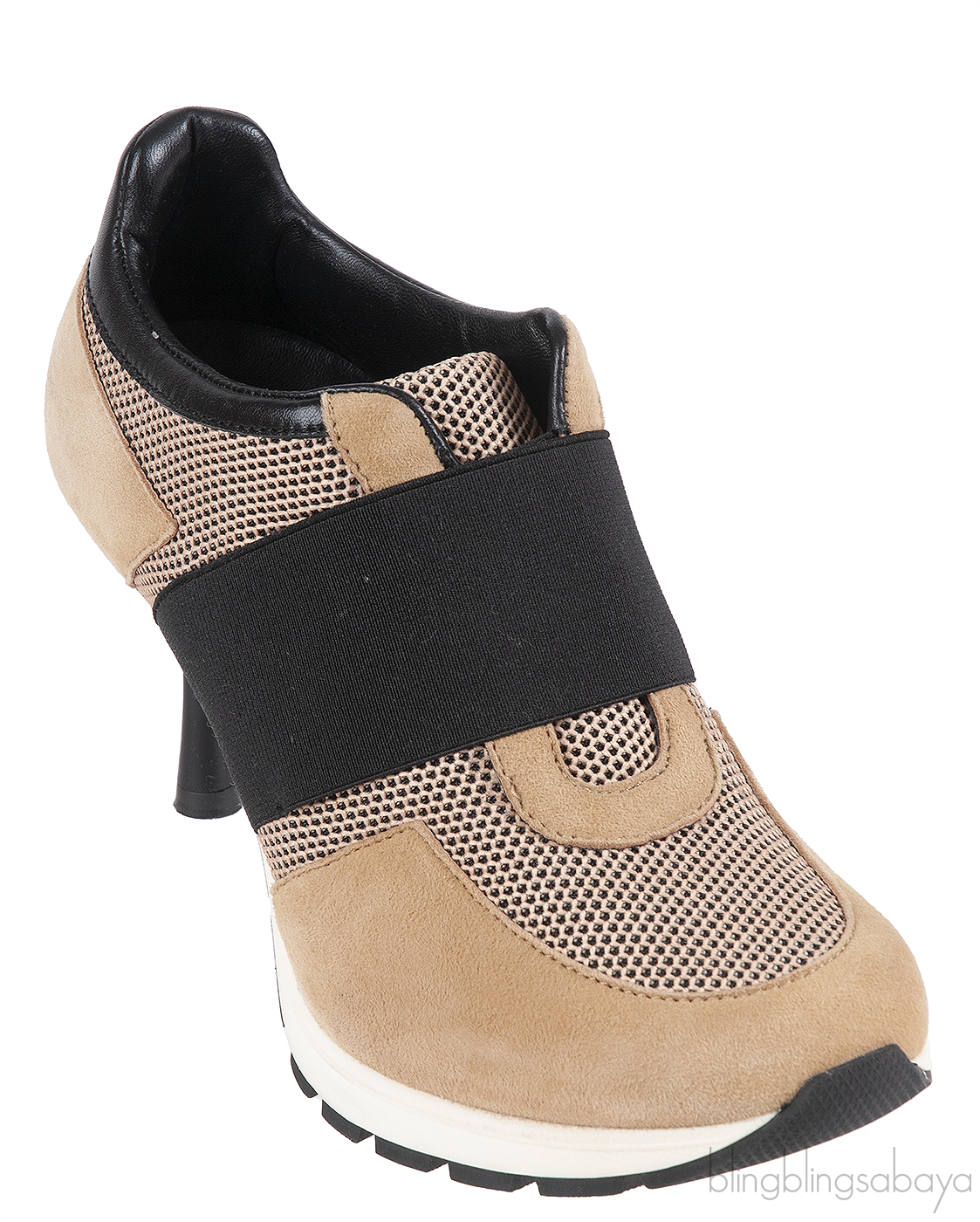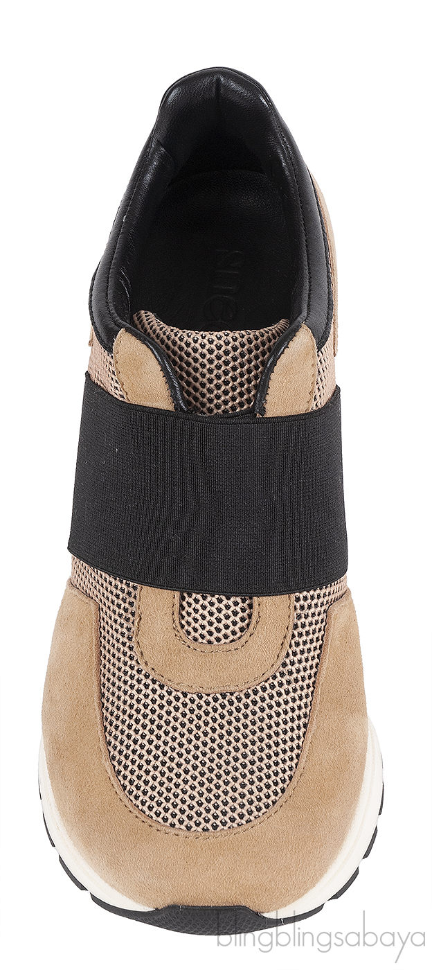These Sneex The Icon Hy-heel Light Brown Sneaker is crafted from suede leather, mesh fabric, black elastic strap and black leather accent. This hybrid heels features a wide elastic strap with slip-on construction that hugs the foot, leather lined insole, slip-on, rubber like sole and 78 mm heels. This shoes has a comfortable toe box and arch support designed for elegance and ease.