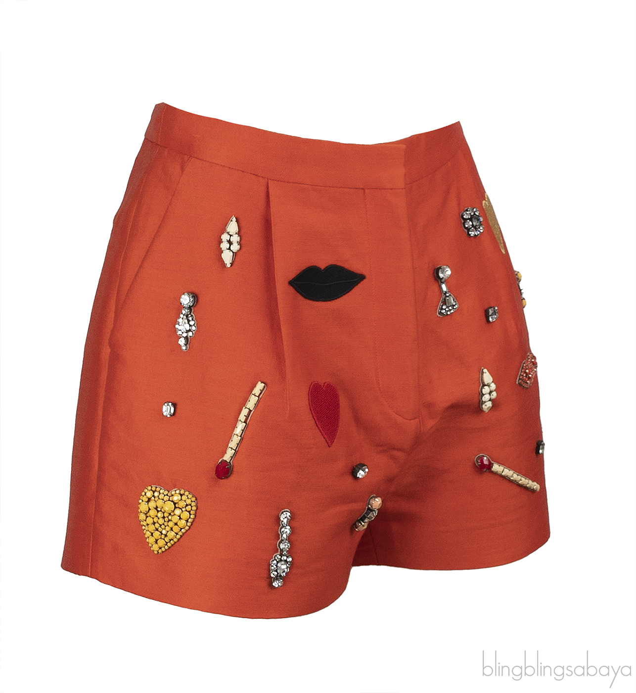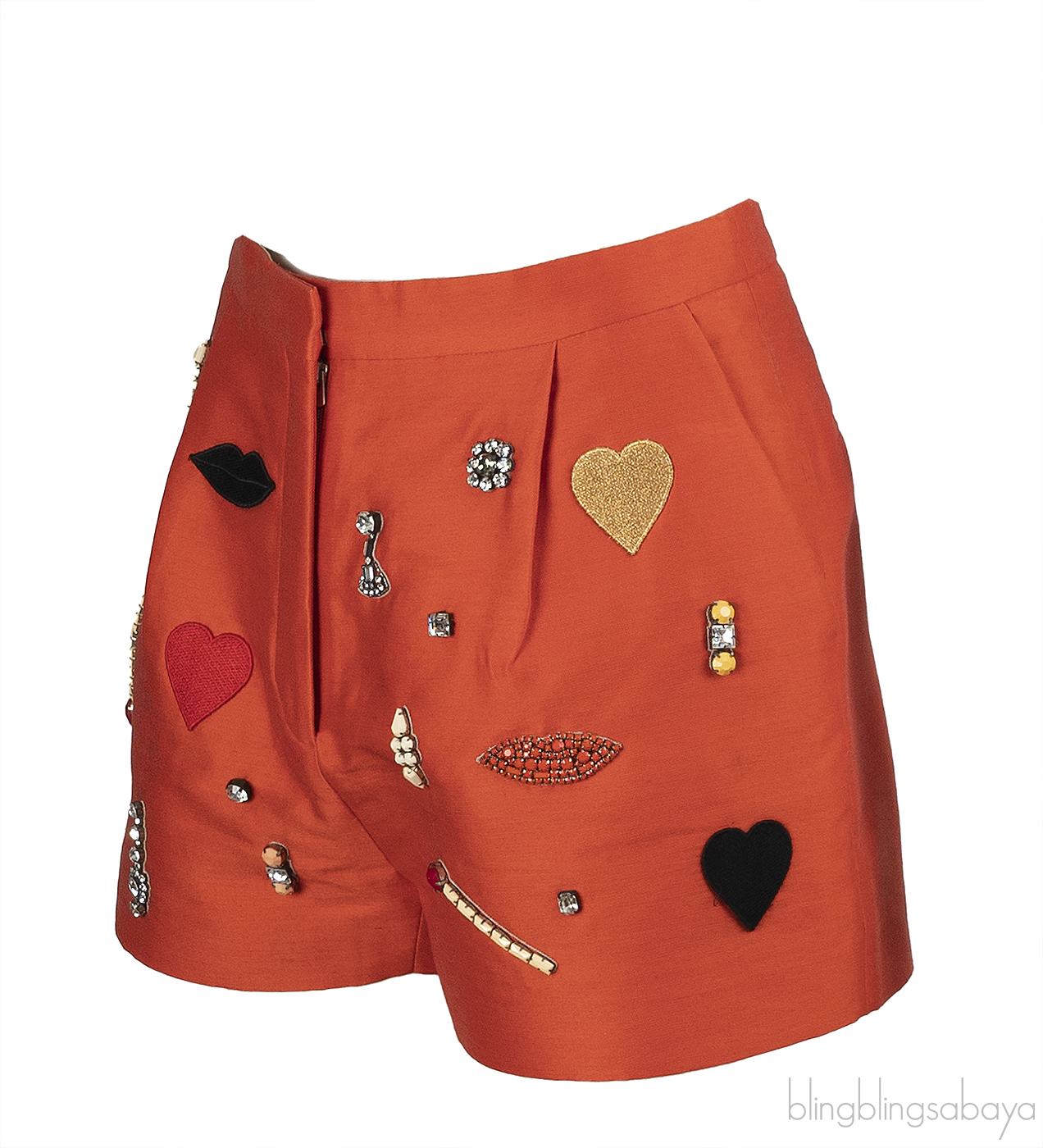 This Stella McCartney embellished cotton-blend short is crafted from a luxurious blend of cotton, polyester, and silk in a vibrant orange hue. Featuring pleat detailing at the front, side slit pockets, back welt pockets, and a hook-and-zip closure. The piece is adorned with resin and glass crystal accents, beautifully complemented by intricate embroidered patches, adding a touch of glamour and uniqueness to the design.