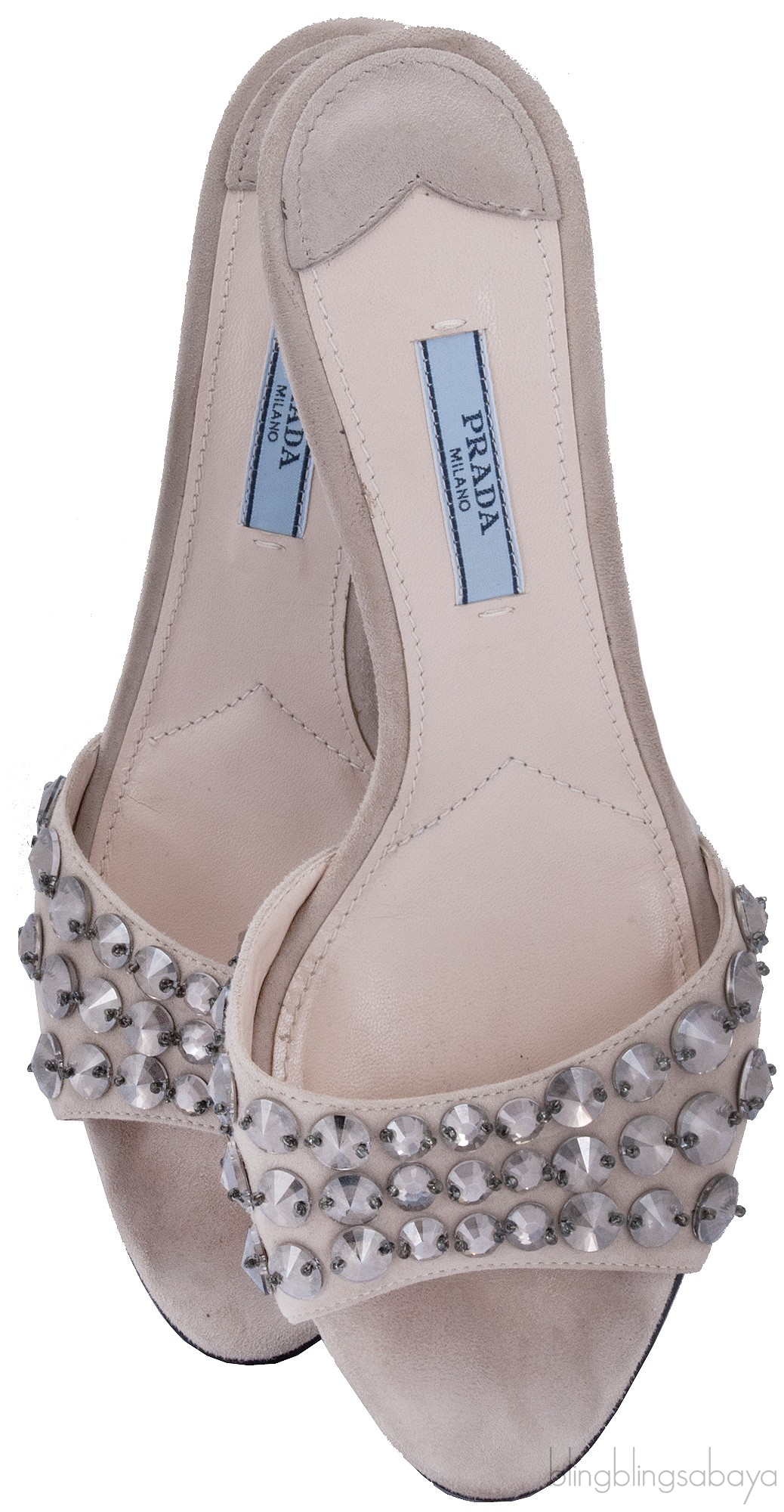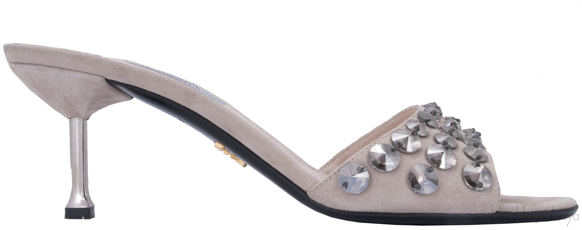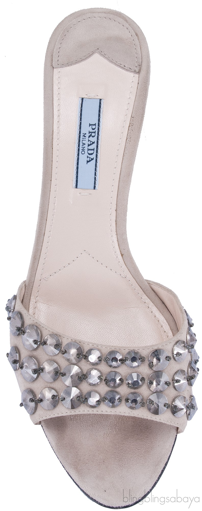 This Suede Crystal Mid-heel Sandals from Prada is made of beige suede upper and sole lining featuring a crystal embellished vamp, almond toe and 60 mm high silver metal heels.