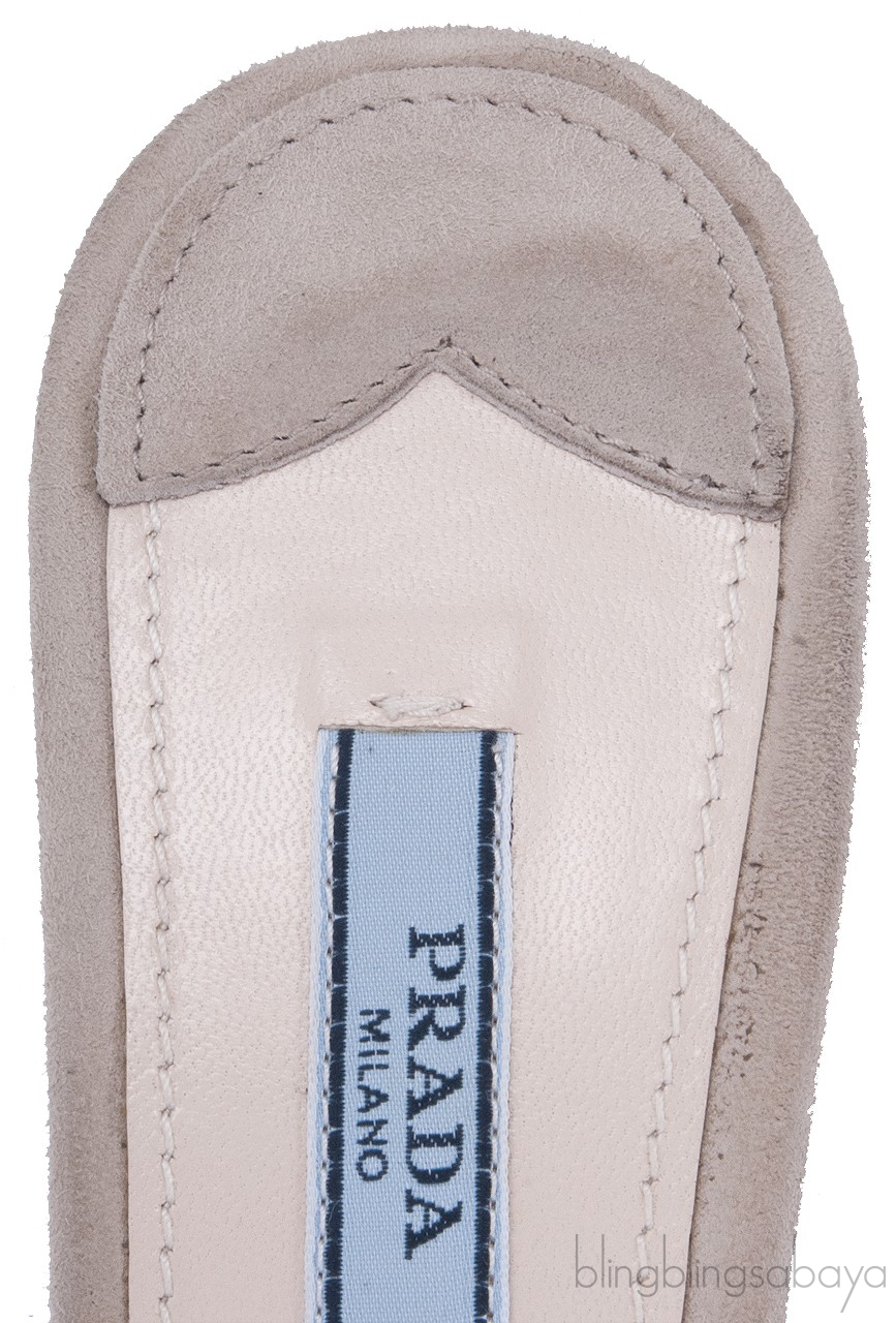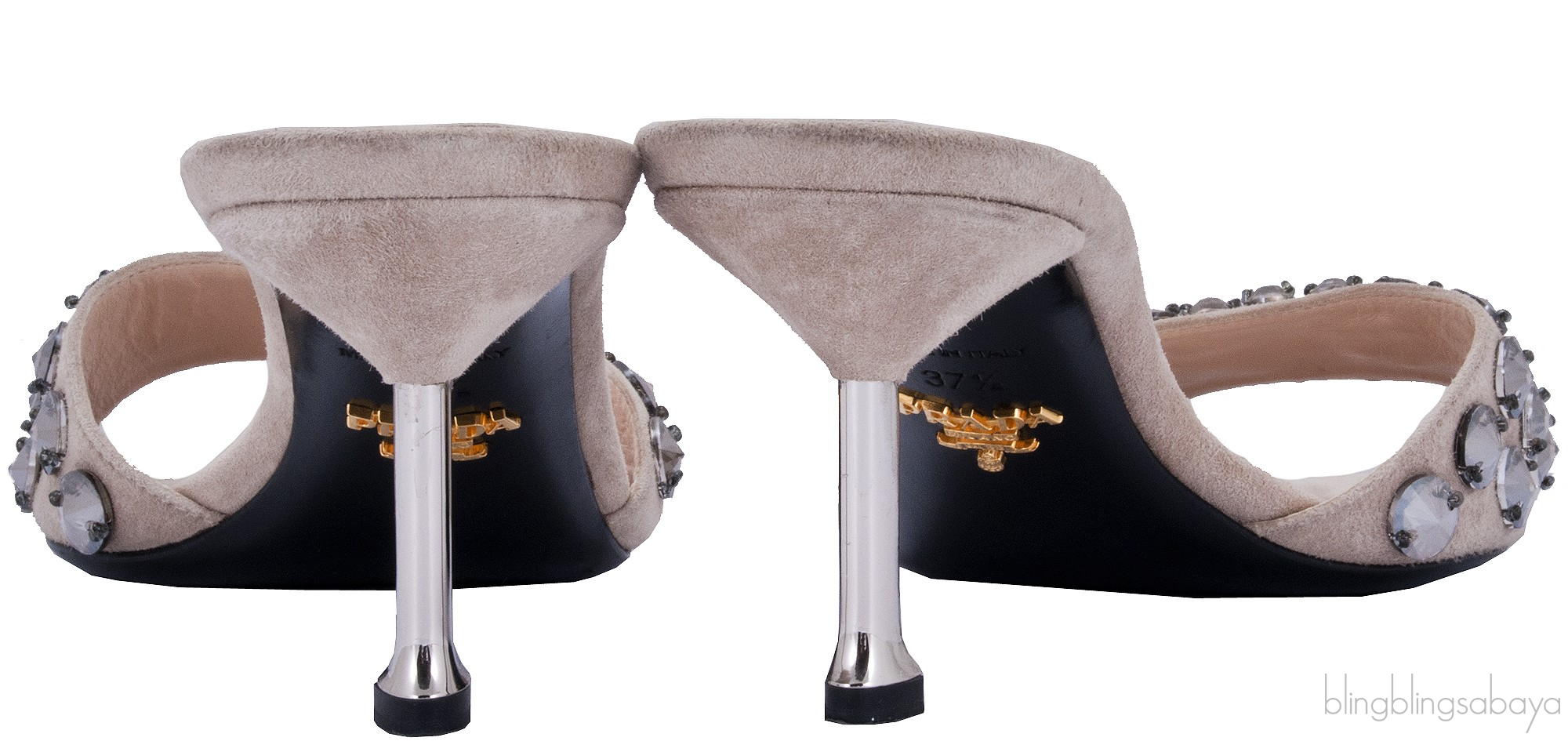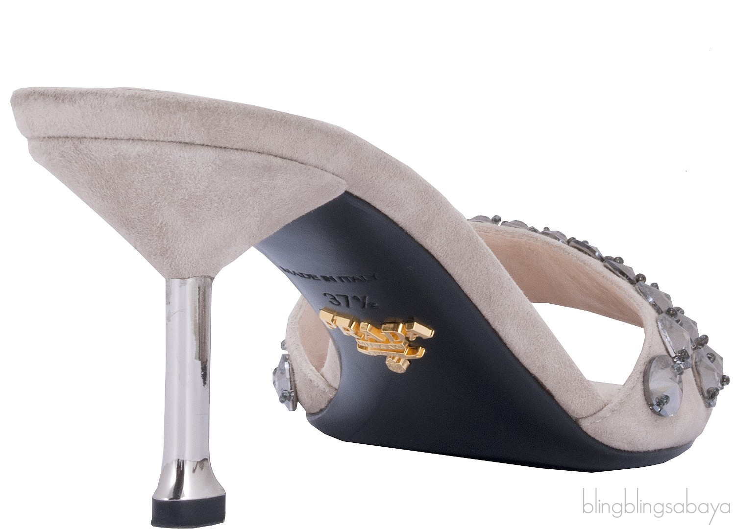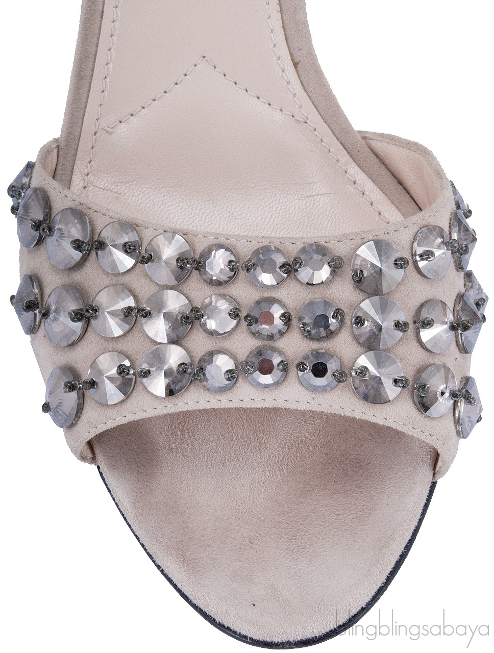 This Suede Crystal Mid-heel Sandals from Prada is made of beige suede upper and sole lining featuring a crystal embellished vamp, almond toe and 60 mm high silver metal heels.