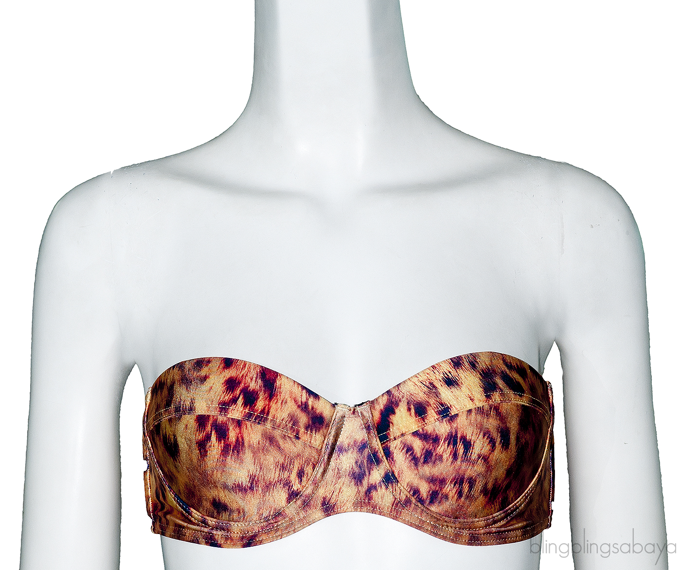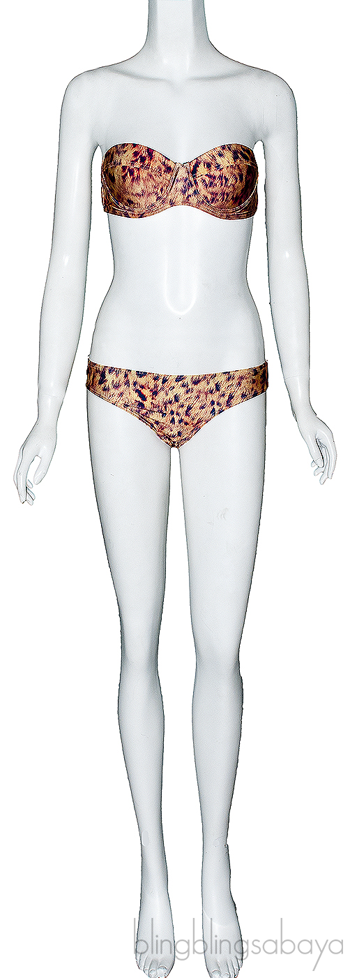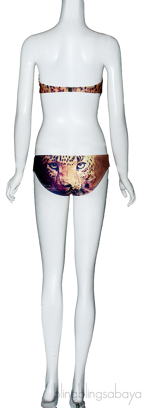 This Tiger Print Bikini & Top from We Are Handsome is made in 80% Polyester and 20% Lycra featuring a strapless top, underwire, sweetheart neckline, side boning and metal fastening at rear and tiger printing all over. Bikini bottom features a tiger face print at rear.