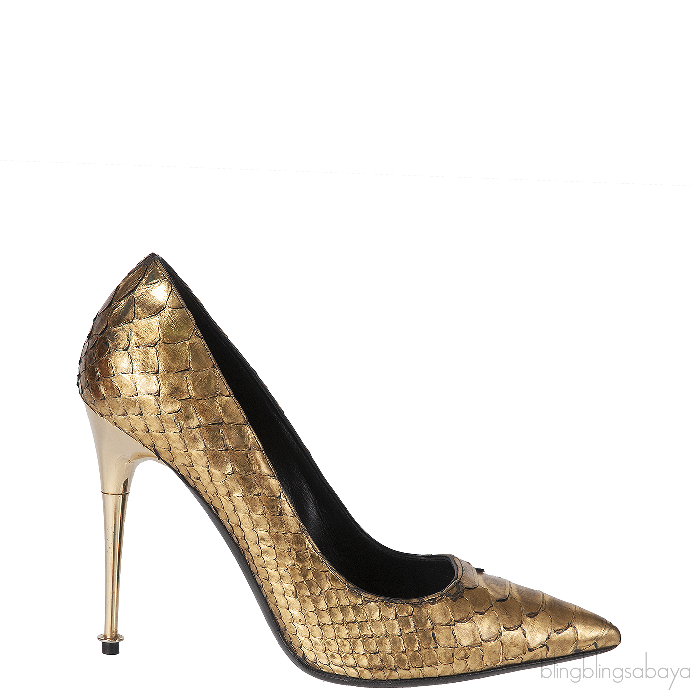 These Python Gold Pointed Heels from Tom Ford are crafted in gold python leather upper with black leather lining. These Heels features a pointed toe, leather lined insole, gold heels measuring 100 mm high and black leather sole.