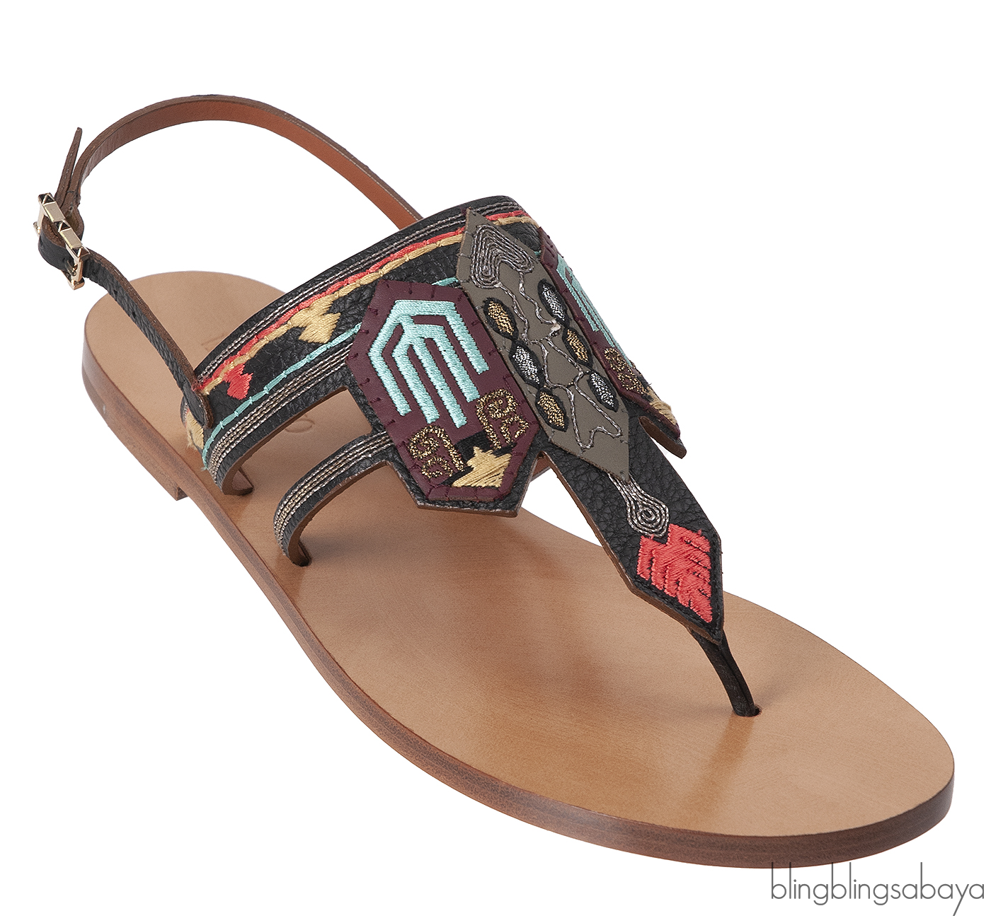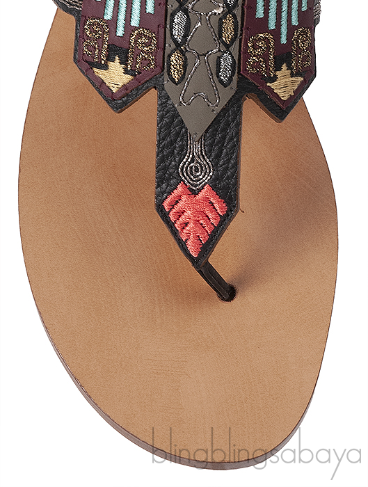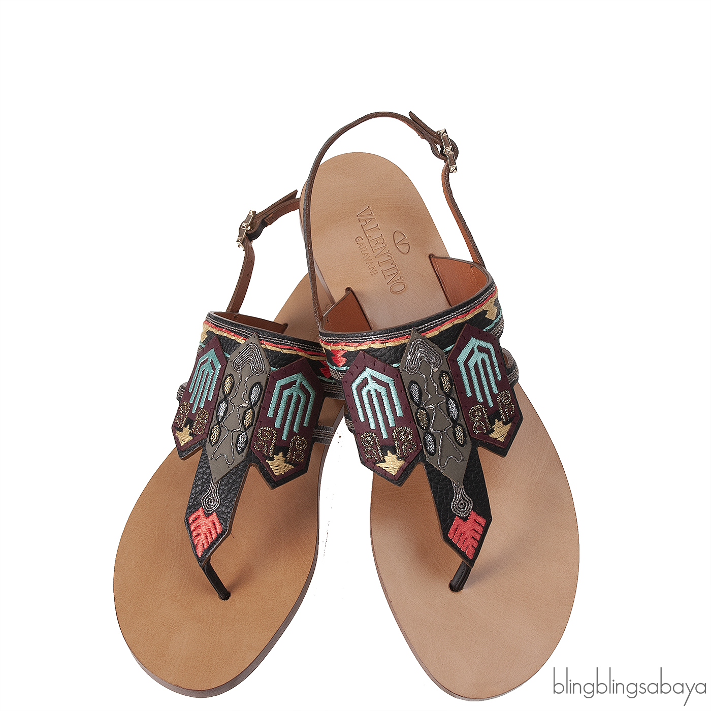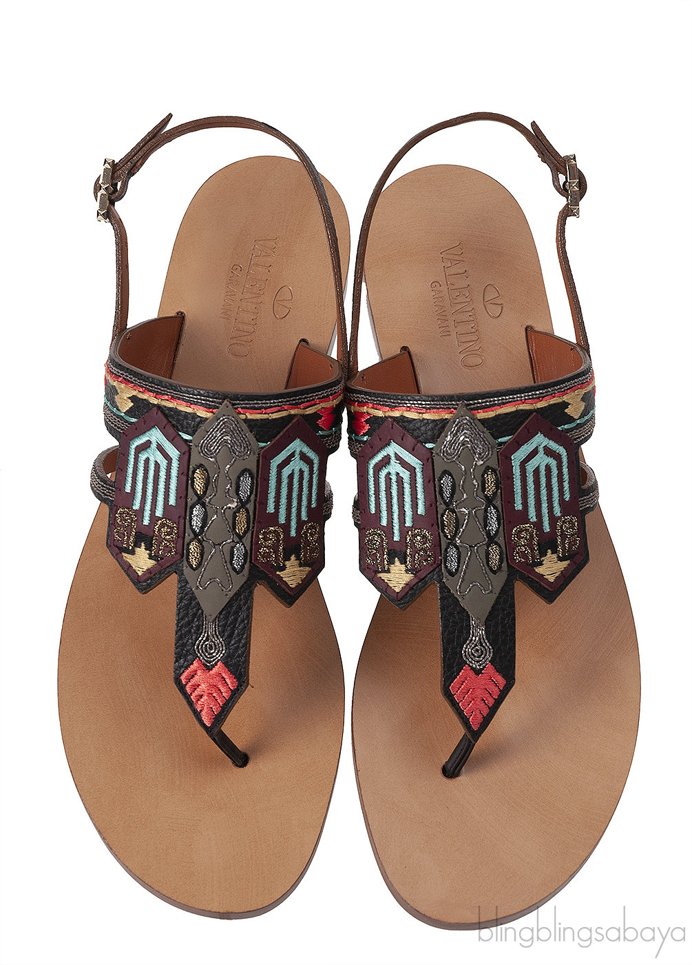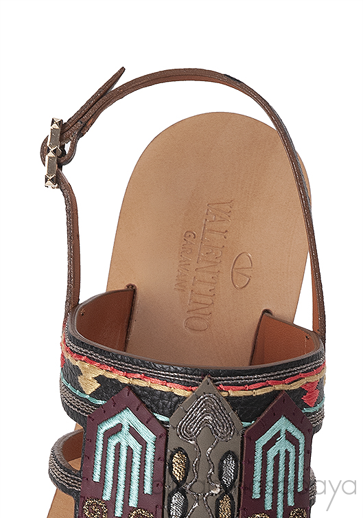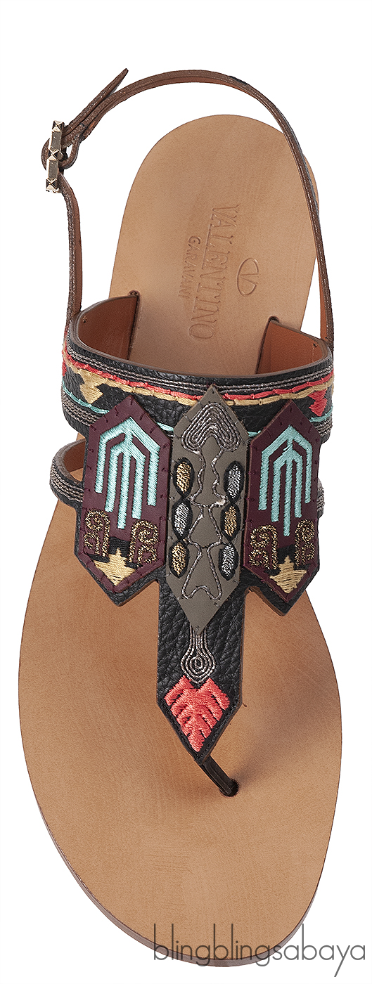 This so comfortable Multi-color Slip On Sandals from Valentino Garavani is crafted in black leather upper with multi-color ethnic design on the vamp, sling back with buckle fastening, brown leather insole and sole.