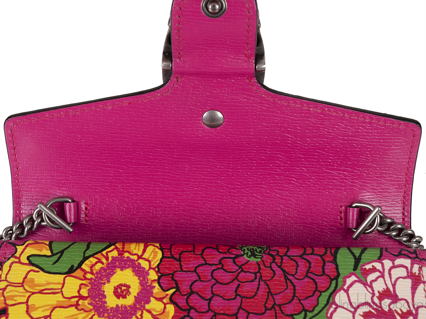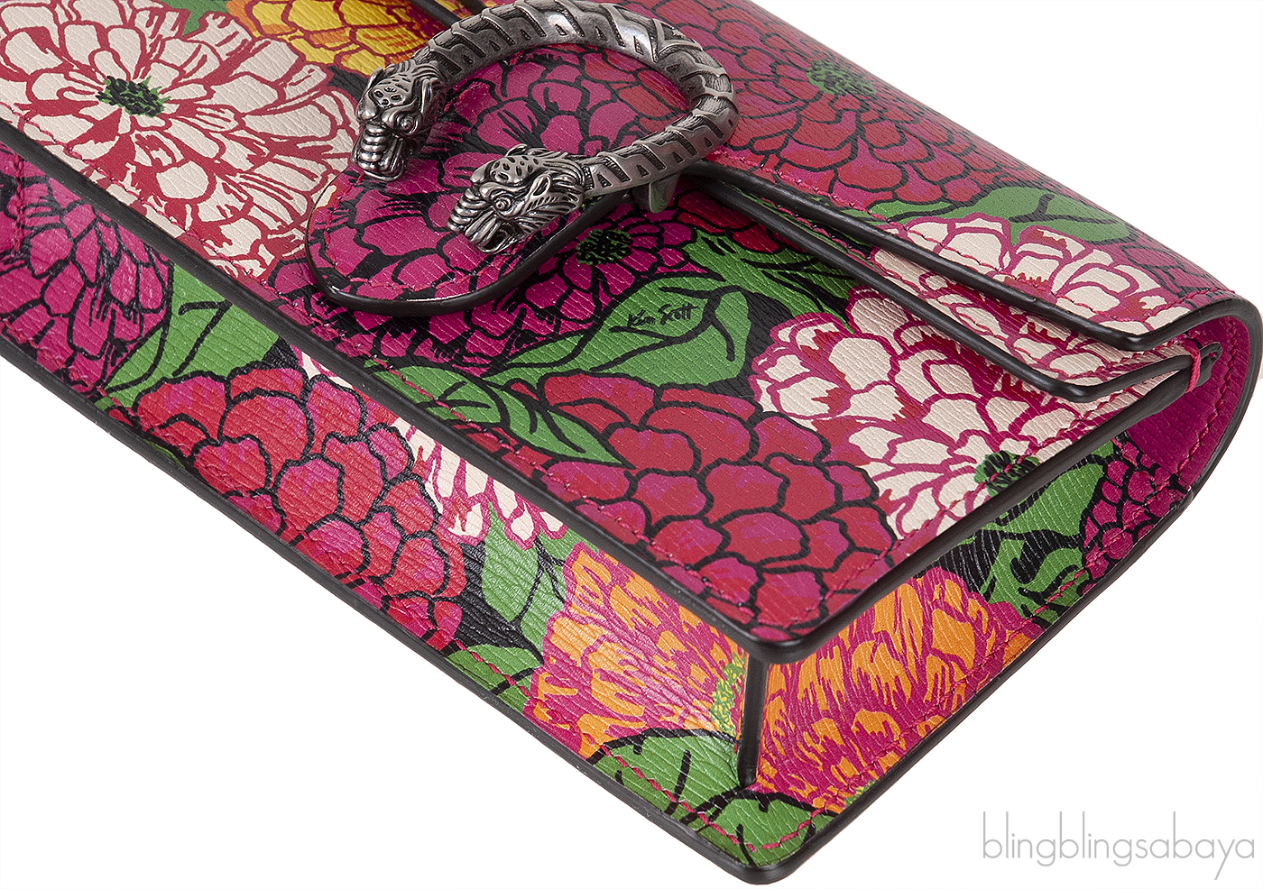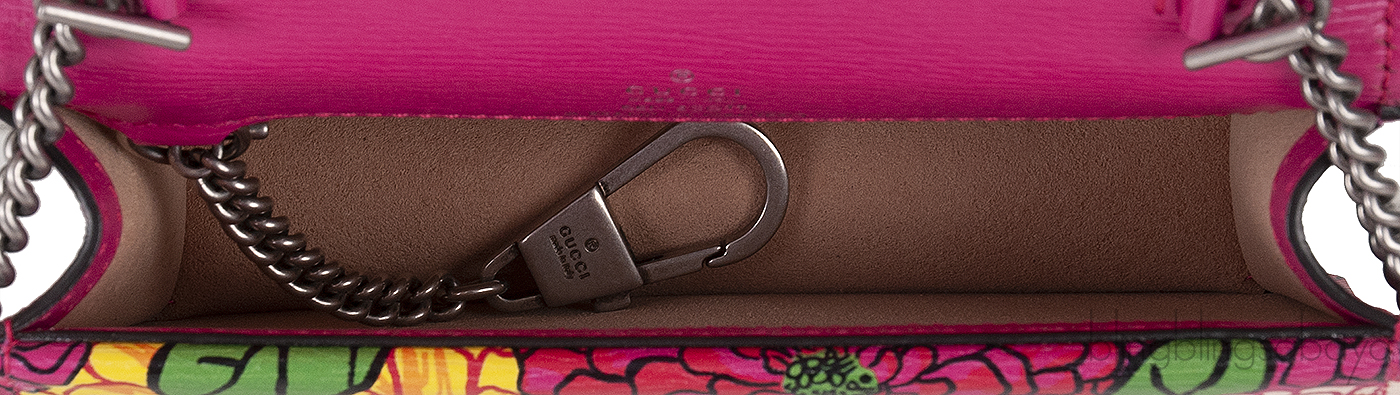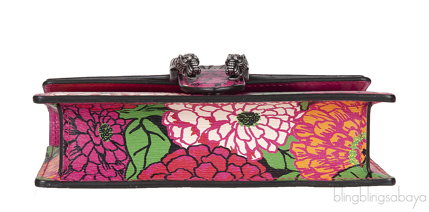 The Gucci X KEN SCOTT Pomponica Print Dionysus Shoulder Mini Bag is made from luxurious calfskin leather. It features a vibrant multicolor floral print, complemented by a dark silver linked chain shoulder strap and a signature tiger head horseshoe spur closure on the front flap. Inside, you'll find an interior crafted from natural fibers with no pocket
