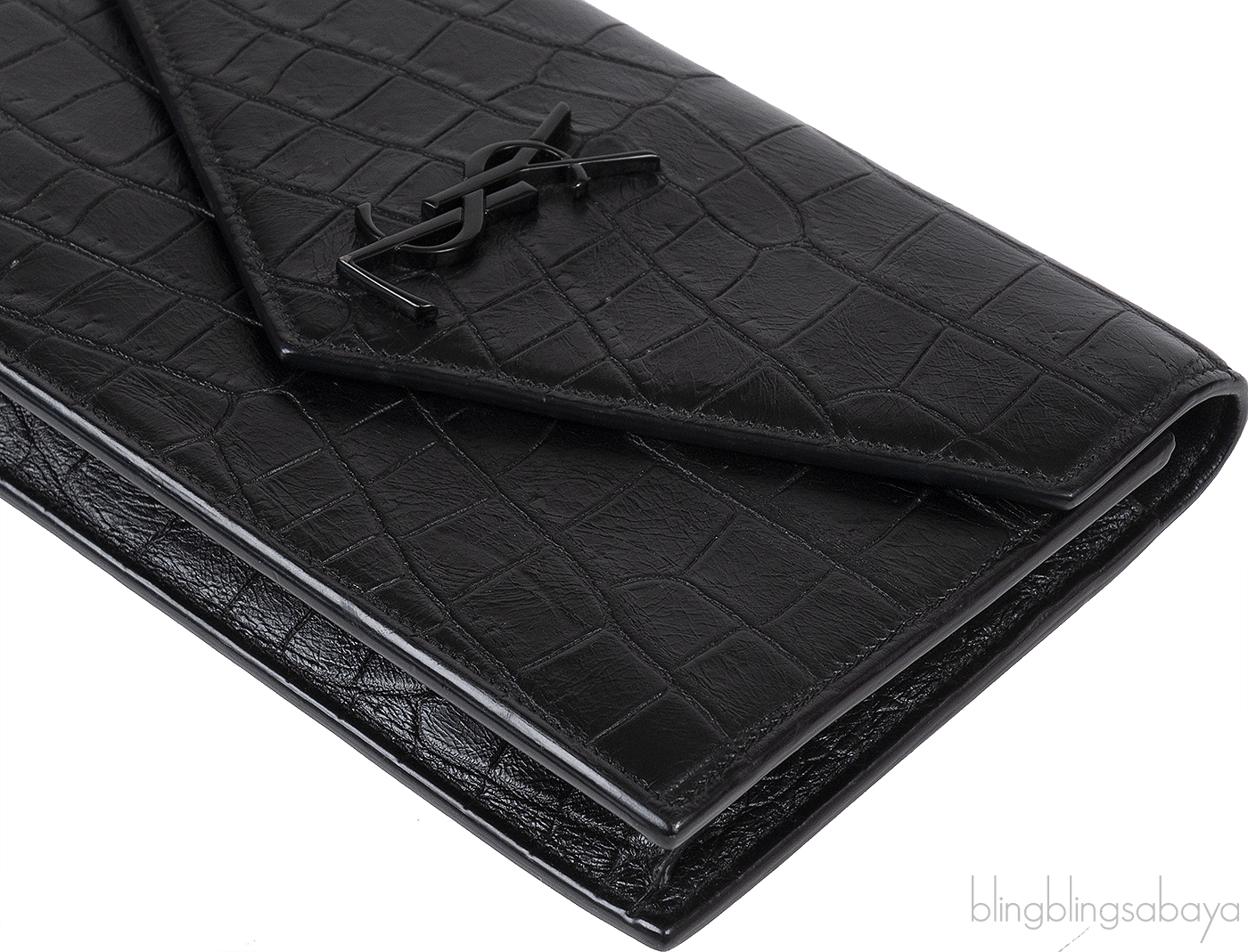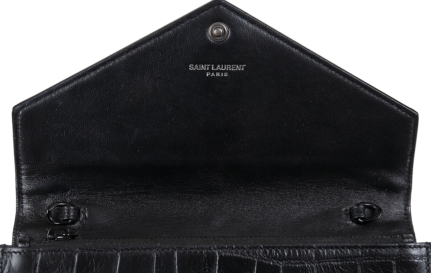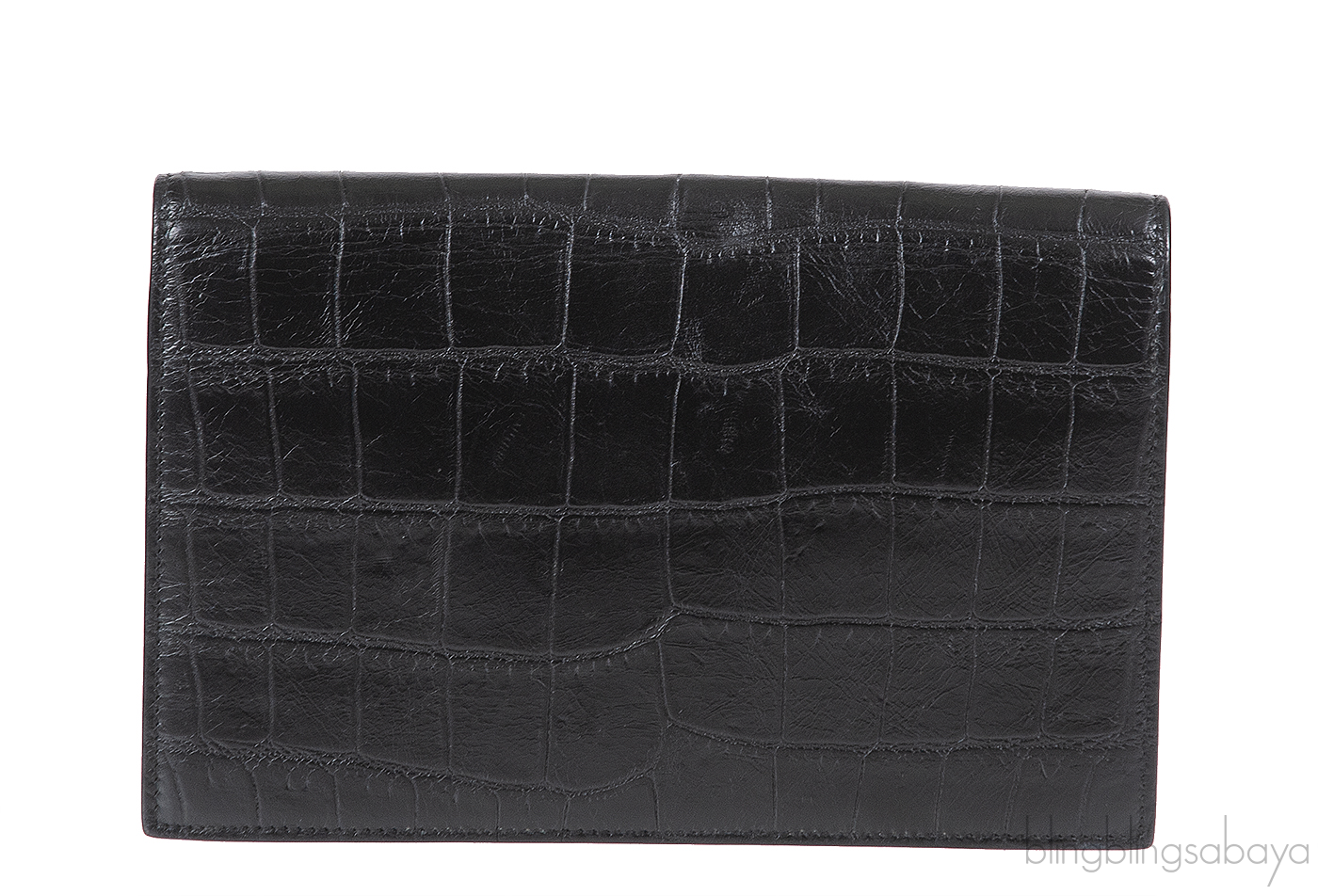 This So Black WOC Croc Print from Yves Saint Laurent is made of crocodile print black leather perfectly accented with the black metal hand wares.