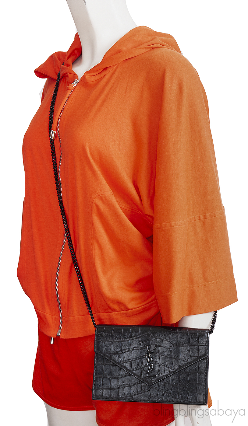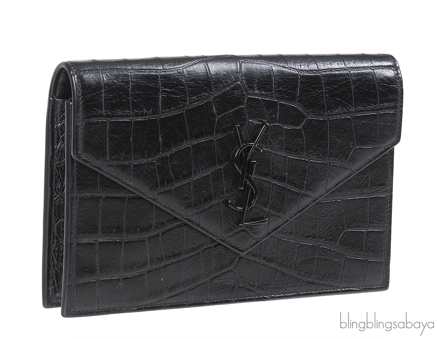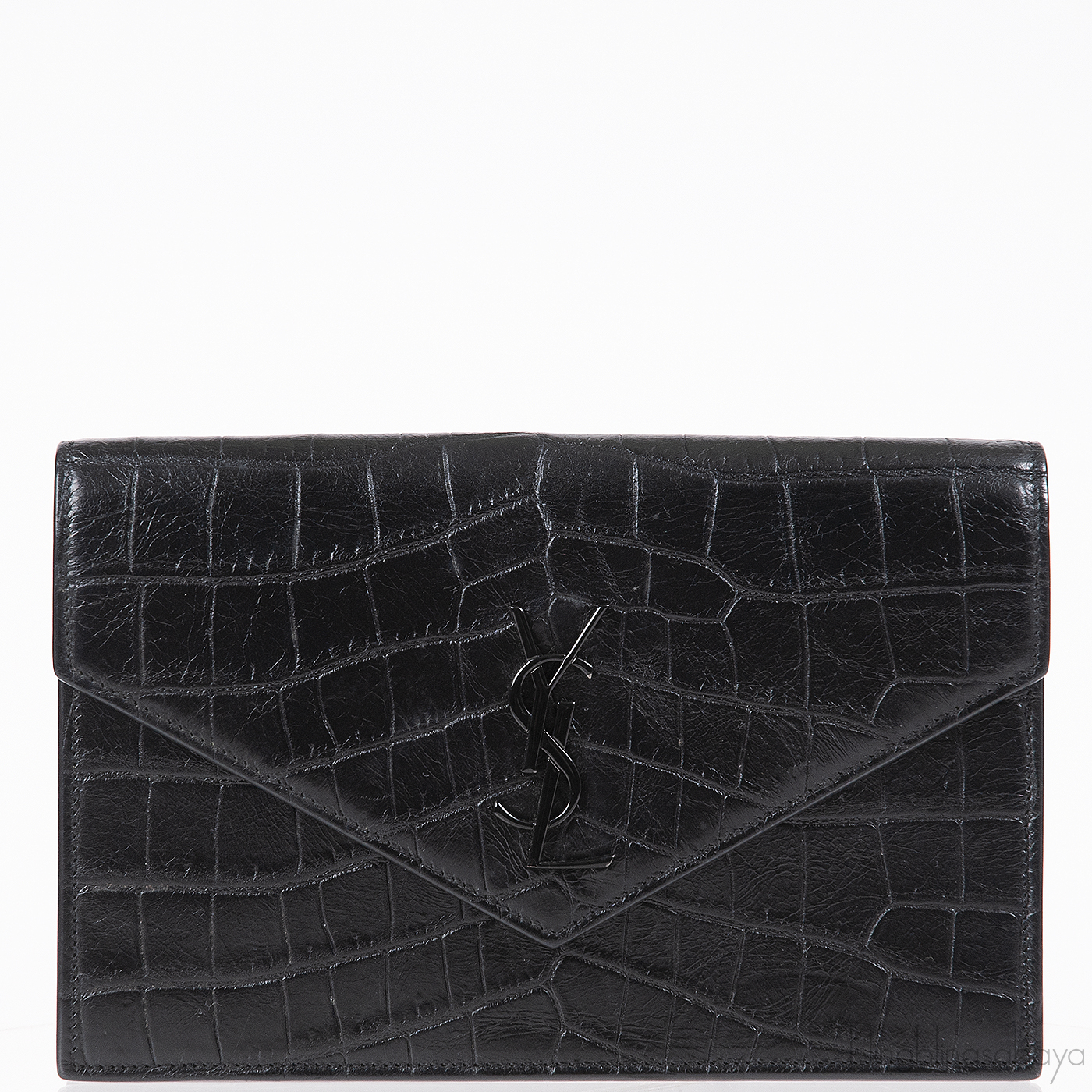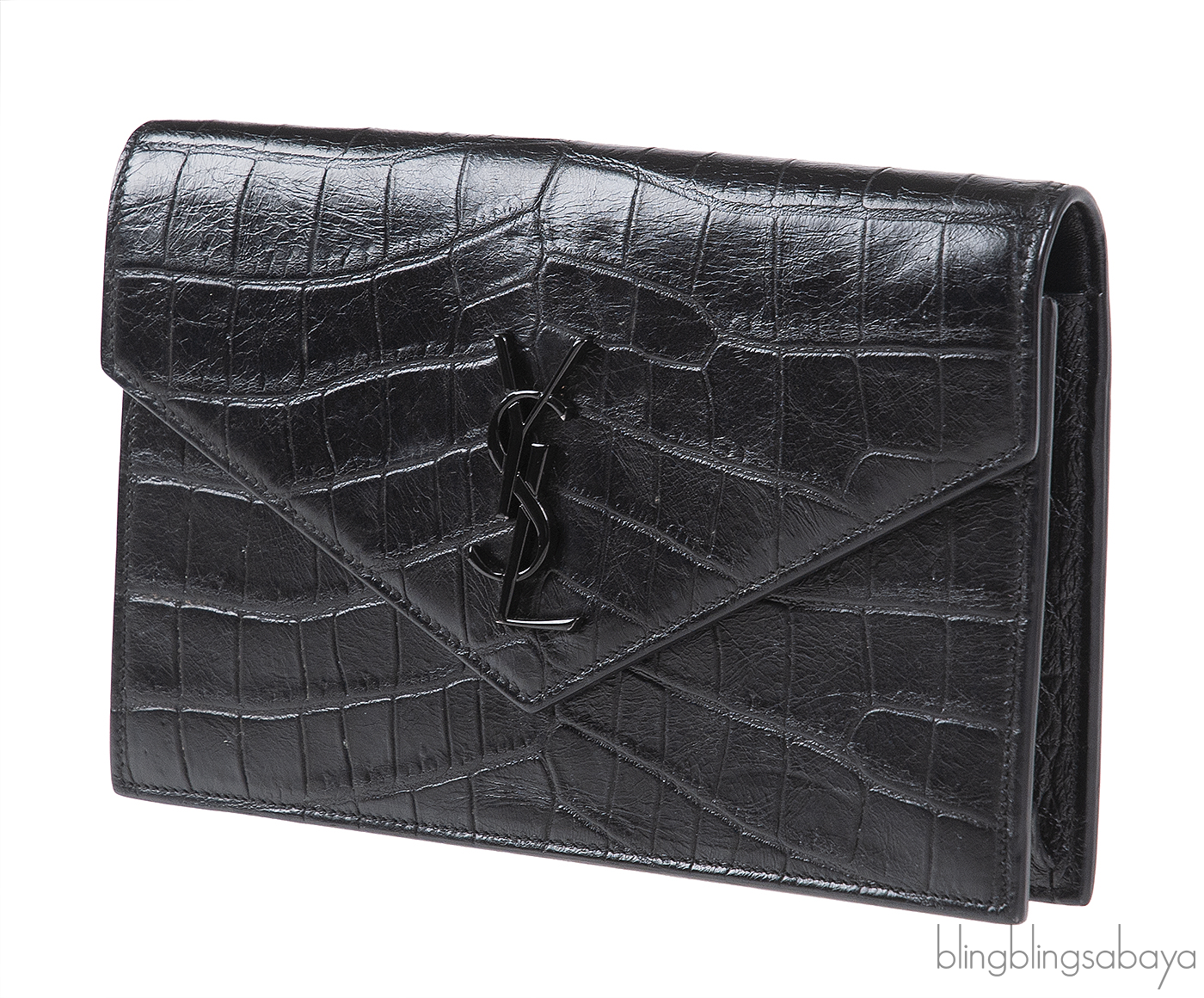 This So Black WOC Croc Print from Yves Saint Laurent is made of crocodile print black leather perfectly accented with the black metal hand wares.