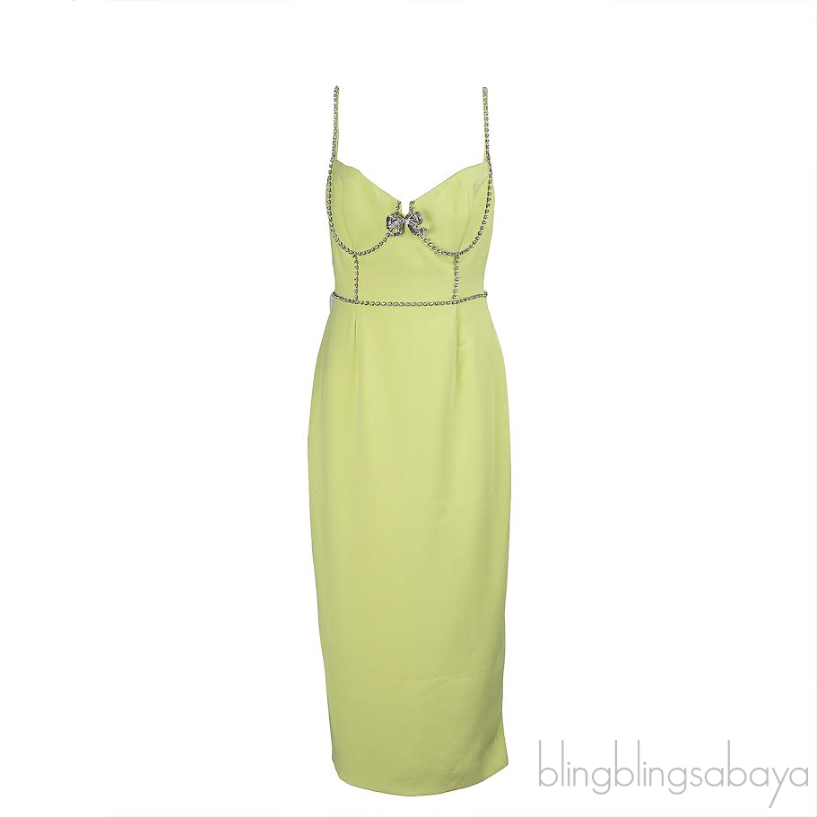 Self-Portrait Lime Crepe Bow Midi DressThis Self-Portrait Bow Midi Dress in lime is crafted from 100% polyester and fully lined, featuring a notched bustier with diamanté bows and trim, a sleek column-style midi skirt, and a concealed zip fastening for a polished finish.