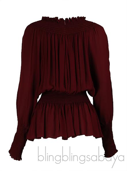 Elie Saab Maroon Smocked Georgette Blouse This Elie Saab Maroon Smocked Georgette Blouse is crafted from 100% silk in a rich burgundy shade. This Elie Saab blouse showcases a smocked elastic neckline with soft front gathers. Designed with an elasticated waist that creates a flattering peplum silhouette, it is finished with long sleeves and elastic cuffs for an elegant, feminine touch.