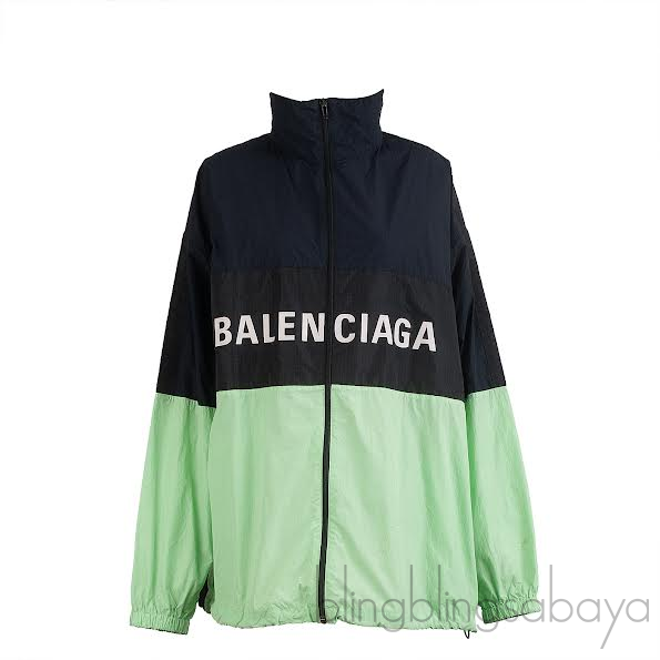 Balenciaga Logo Print Zip-Up Tri-color JacketThis Balenciaga Logo Print Zip-Up Tri-color Jacket is crafted from 100% polyamide fabric . This jacket features a striking tri-color design in blue, green, and black. Cut in an oversized silhouette, it is detailed with a stand-up collar, contrast logo print at the front, full zip fastening, and long sleeves with elasticated cuffs. The color-block construction is finished with a drawstring hem for an adjustable fit.