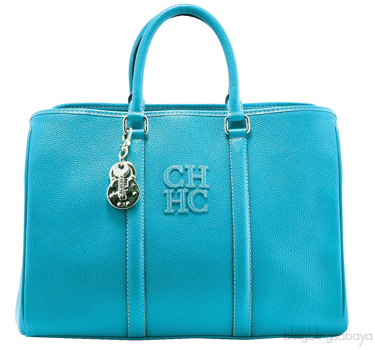 This glamorous tote bag from Carolina Herrera is elegantly crafted in eye catching aqua marine soft pebbled leather in golden hardware. This features the brand logo stitched on the front with key and lock charms dangling on one side of the bag. It has the open top that allows an easy access to the roomy interior lined with monogram fine textile with two major compartment divided with zippered compartment at the middle.