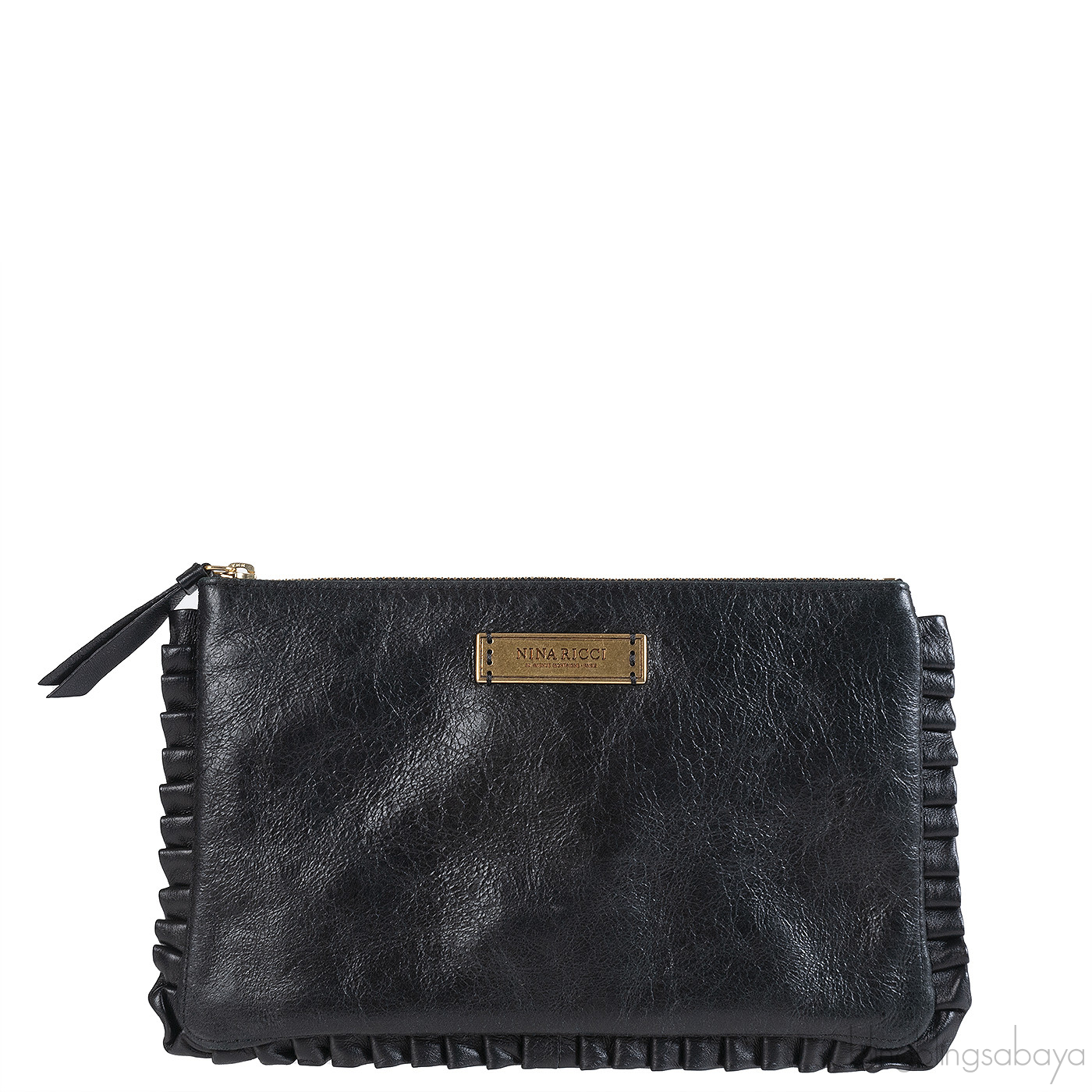 This Black Pleated Trim Clutch from Nina Ricci is crafted in black leather featuring a rectangular clutch with pleats trimming on edges with gold plate logo detailing at front. It has the top zip opening with zip leather pulls giving access to roomy interior with no pockets and has pink fabric lining.
