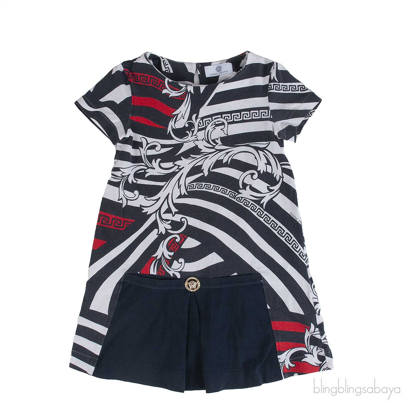 Young Versace Black Printed Kids Dress!This Young Versace Black Printed Dress is crafted from cotton and elastane fabric featuring a multicolor print at front with with medusa buckle and short sleeves