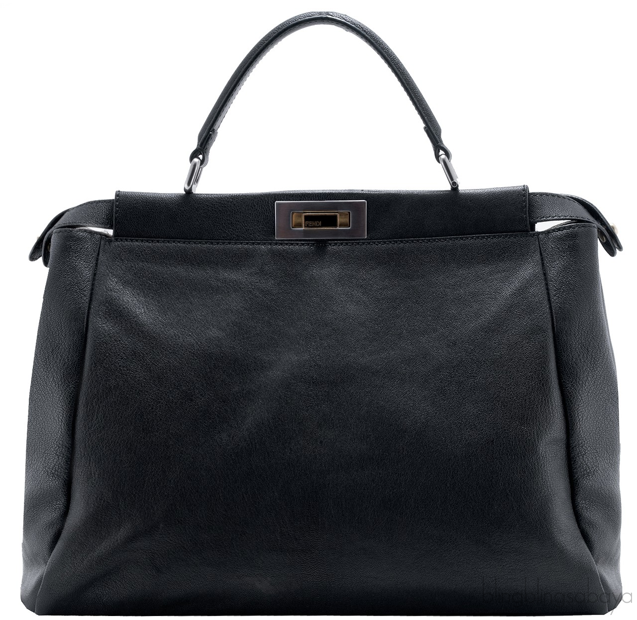 This exquisite Peek-a-boo has gold-tone bolt detail divider, contrasting leather and suede lining. Interior zip pocket.and a gold logo plate inside. Side bands along top with double F engraved button studs disconnect to expand the bag.