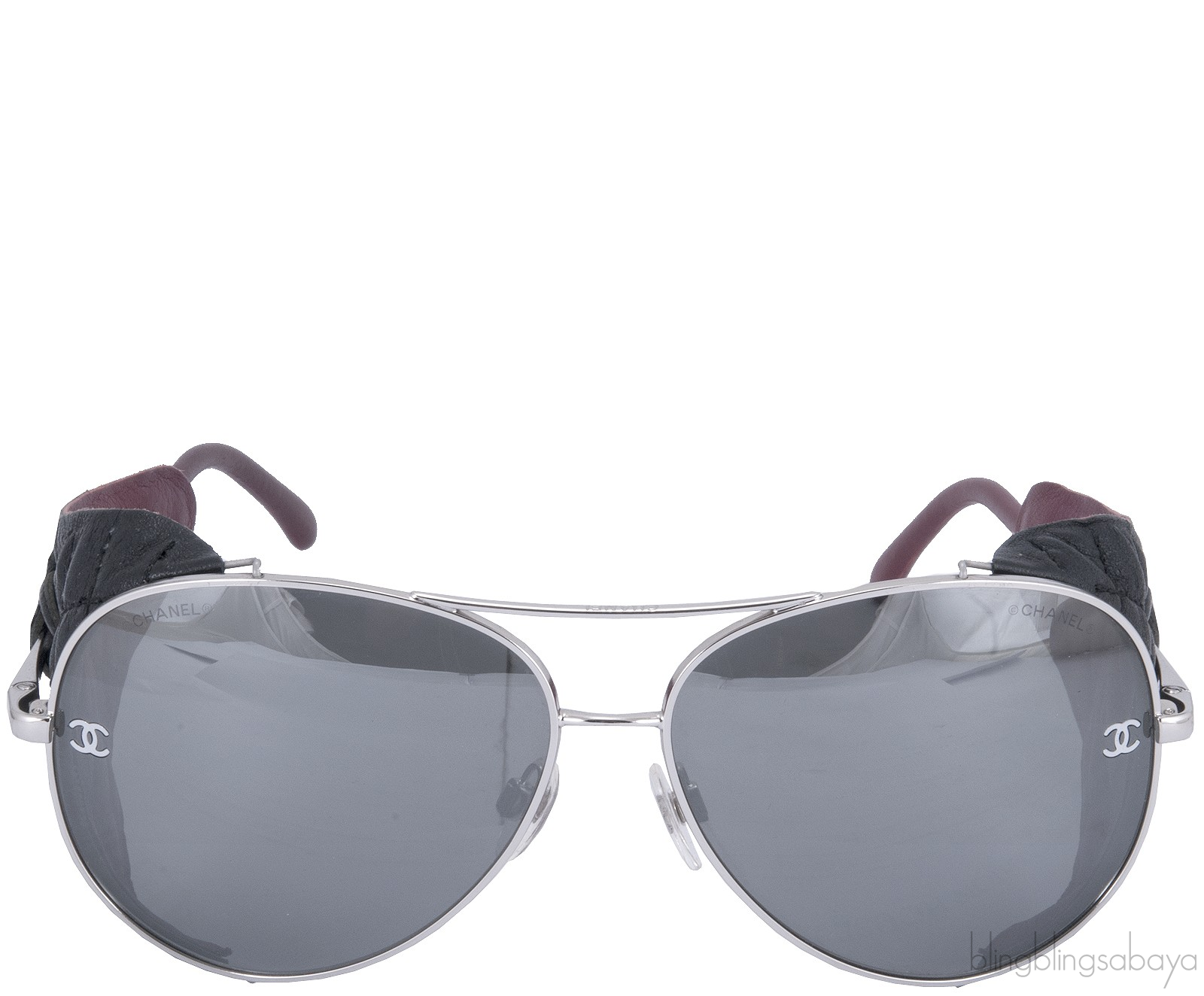 This Limited Edition Lambskin Aviator Sunglasses from Chanel features a silver aviator frame with grey mirrored lenses with small Chanel metal CC inlayed into each lens. This sunglasses also features a removable black quilted lambskin leather blinkers added for eye protection and more stunning look!.