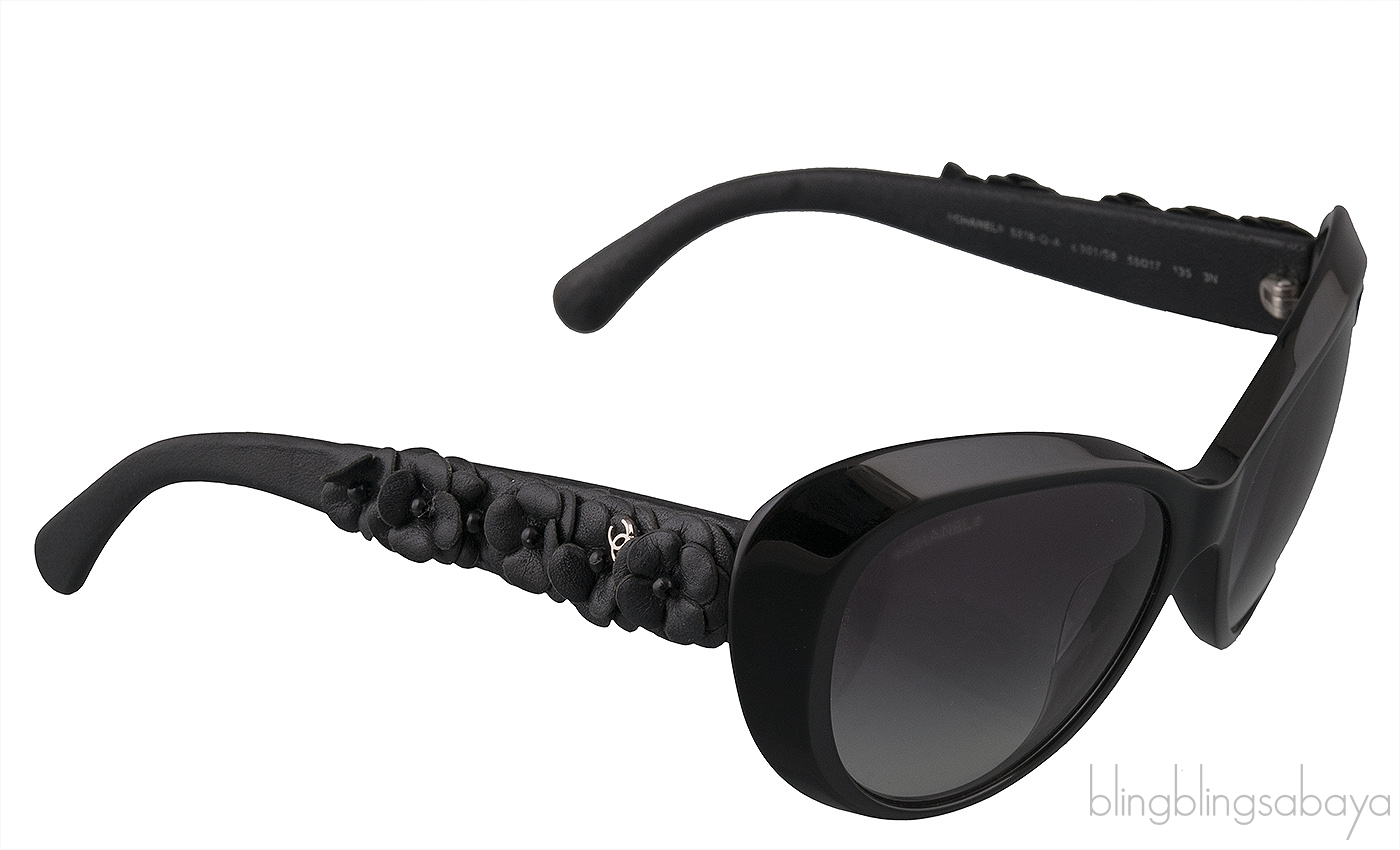 This 5318 - O-A Black Sunglasses from Chanel features an enormous cat-eye frame, with leather camellia arms and a CC emblem on each temple.
