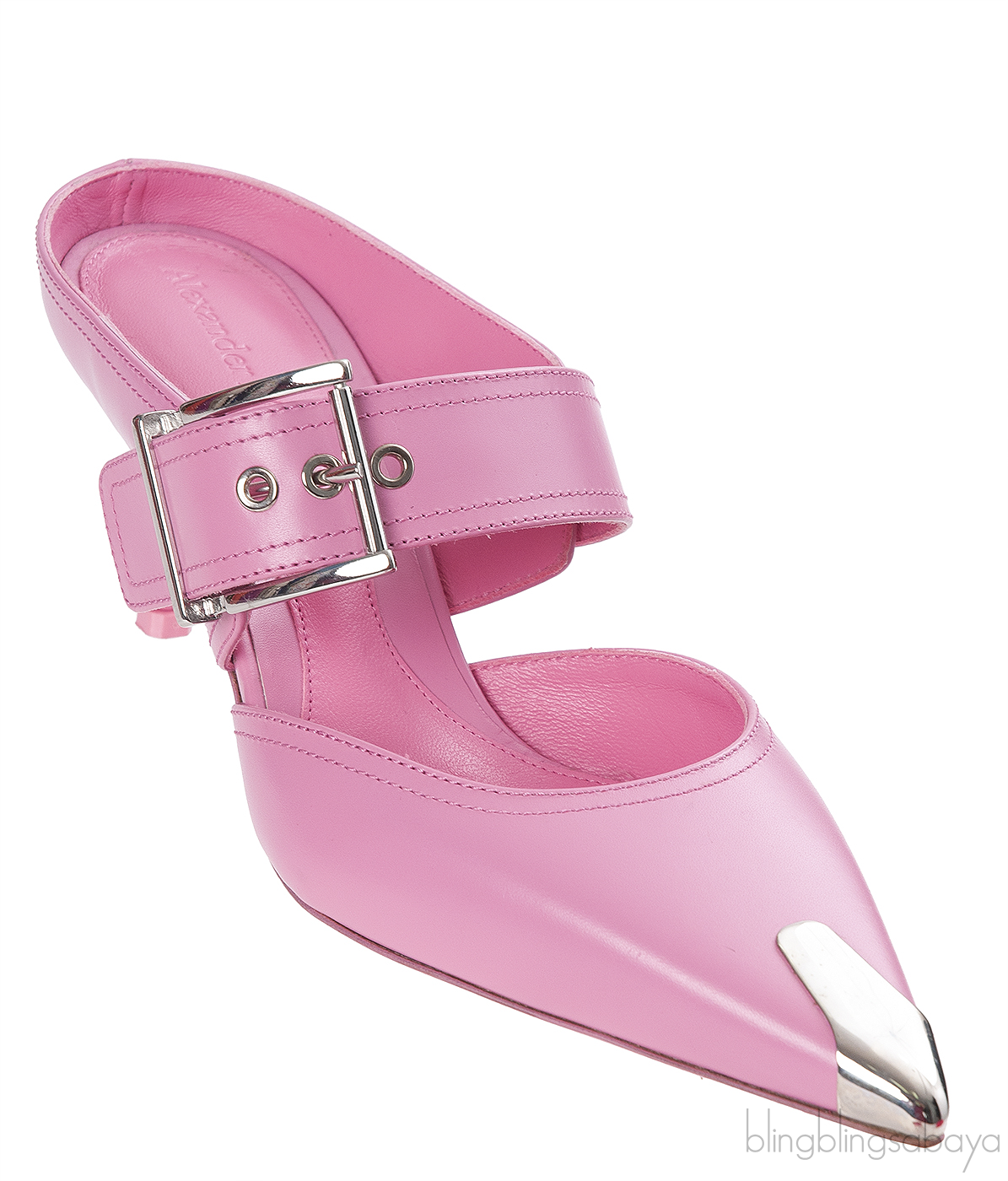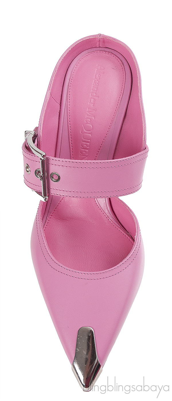 This Alexander McQueen Pink Punk Buckle Mules pair is crafted from pink calf leather and lined with leather. These mules features a pointed-toe silhouette with a metal toe cap, buckle detail, leather lined insole and sole and a high stiletto heel.