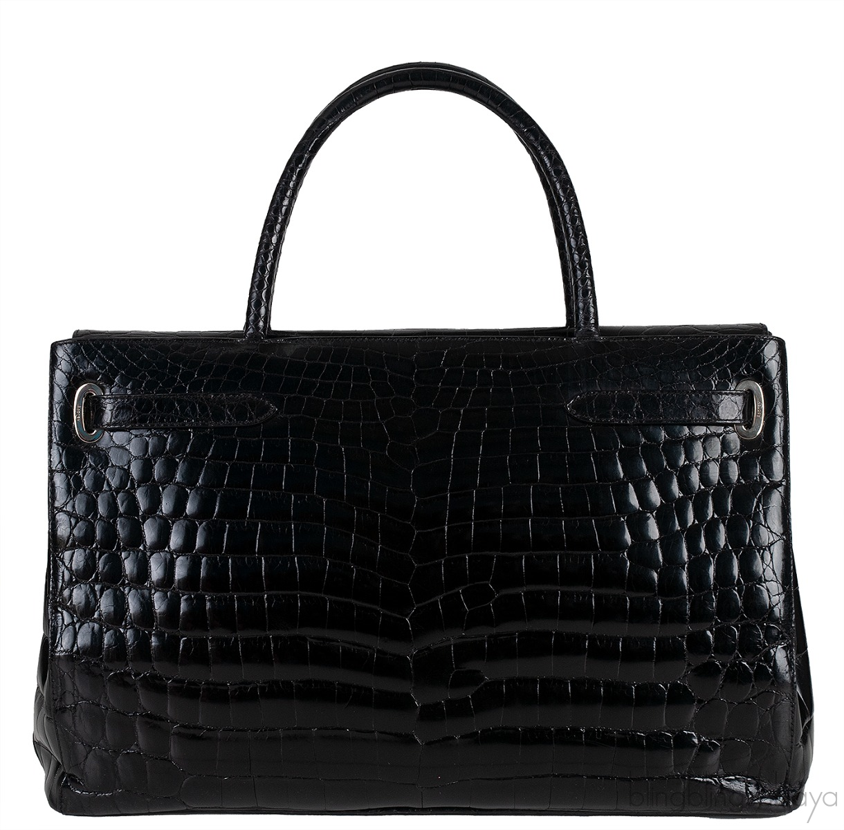 Thi functional Darcy Black Alligator Crocodile Bag provided fresh interpretation to Asprey's traditonal steamer bag. This bag is made in black crocodile skin leather adorned with palladium hardware.