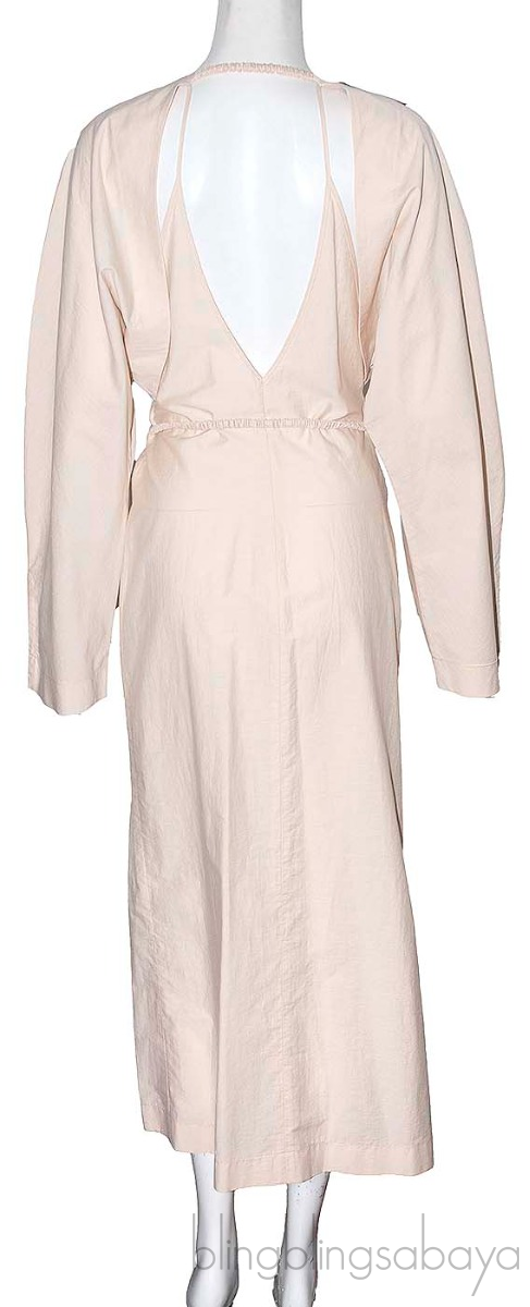 This Beige Canyon Open Back Wrap Dress from Nanushka is crafted from 85% Cotton and 15% Nylon. This dress features a wrap design at front with unexpected cutout back, long sleeves has a wide, waist-cinching belt.