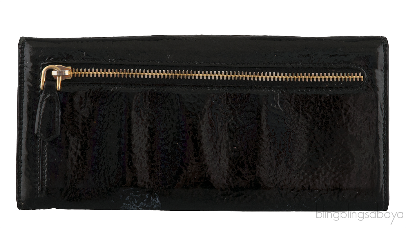 This Black Patent Wallet from Prada is crafted from black patent leather accented with the gold hardware. This wallet features a bi-fold design with gold metal logo and metal trim on corners of the flap cover. Interior is fully lined black leather with 10 credit card slots, bill fold slots and zip compartment inside and zip pocket at rear.