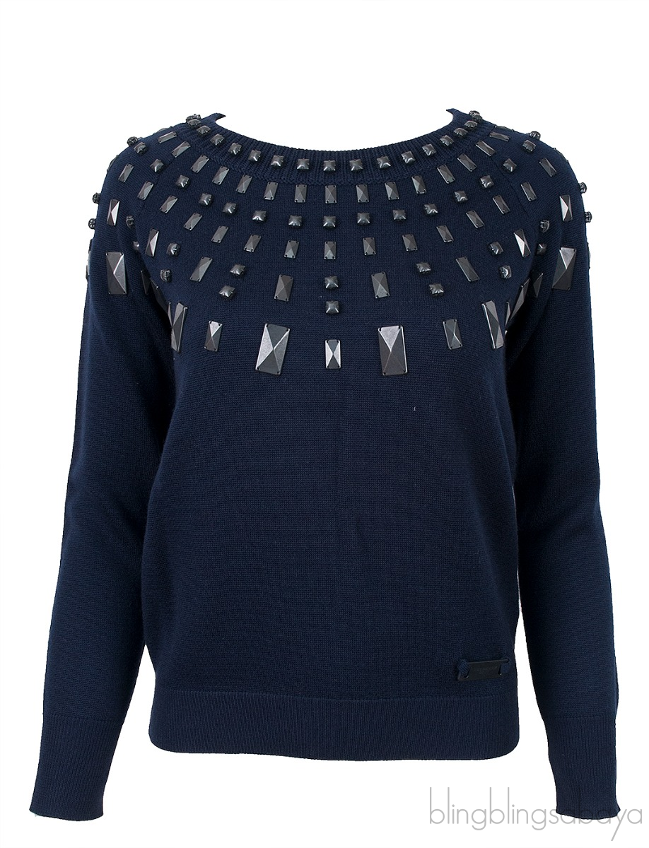This Blue Studded Sweatshirt from Burberry Brit is crafted from 54% Wool and 46% Cotton on dark blue color. This sweatshirt features a ribbed round neckline, long sleeves with ribbed cuffs, black metal studds in different sizes embellishment at front, pull over style and ribbed hemline.
