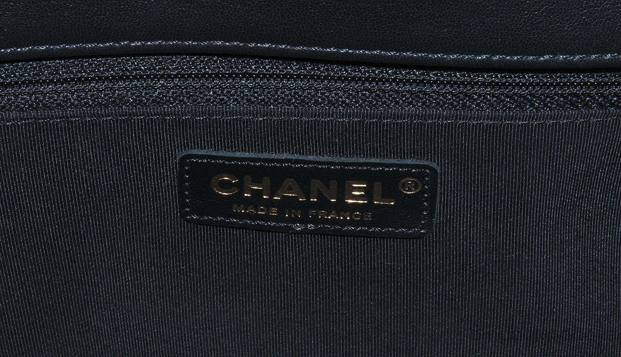 This lovely bag is secure on a push lock closure on the front and the roomy interior lined with black leather has one flat compartment and Chanel signature logo.