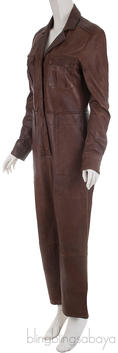 This Brown Artemis Jumpsuit from Veronica Beard is crafted from 100% Lambskin leather and 100% Polyester lining. This Jumpsuit features a smooth, lightly crumpled leather in rich brown hue with classic collar, long sleeves with button cuffs, snap fastening at front, and six pocket styling.