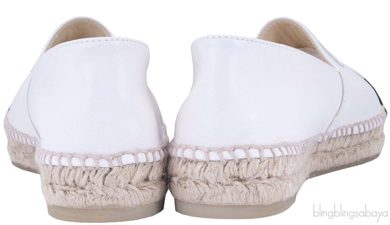 This exciting Espadrille is crafted in stunning white leather upper & black canvas toe. This features a bold CC logo on the vamp and a cap toe. Comfy flat heel with signature off-white leather insole and rubber sole. (Size run small)
