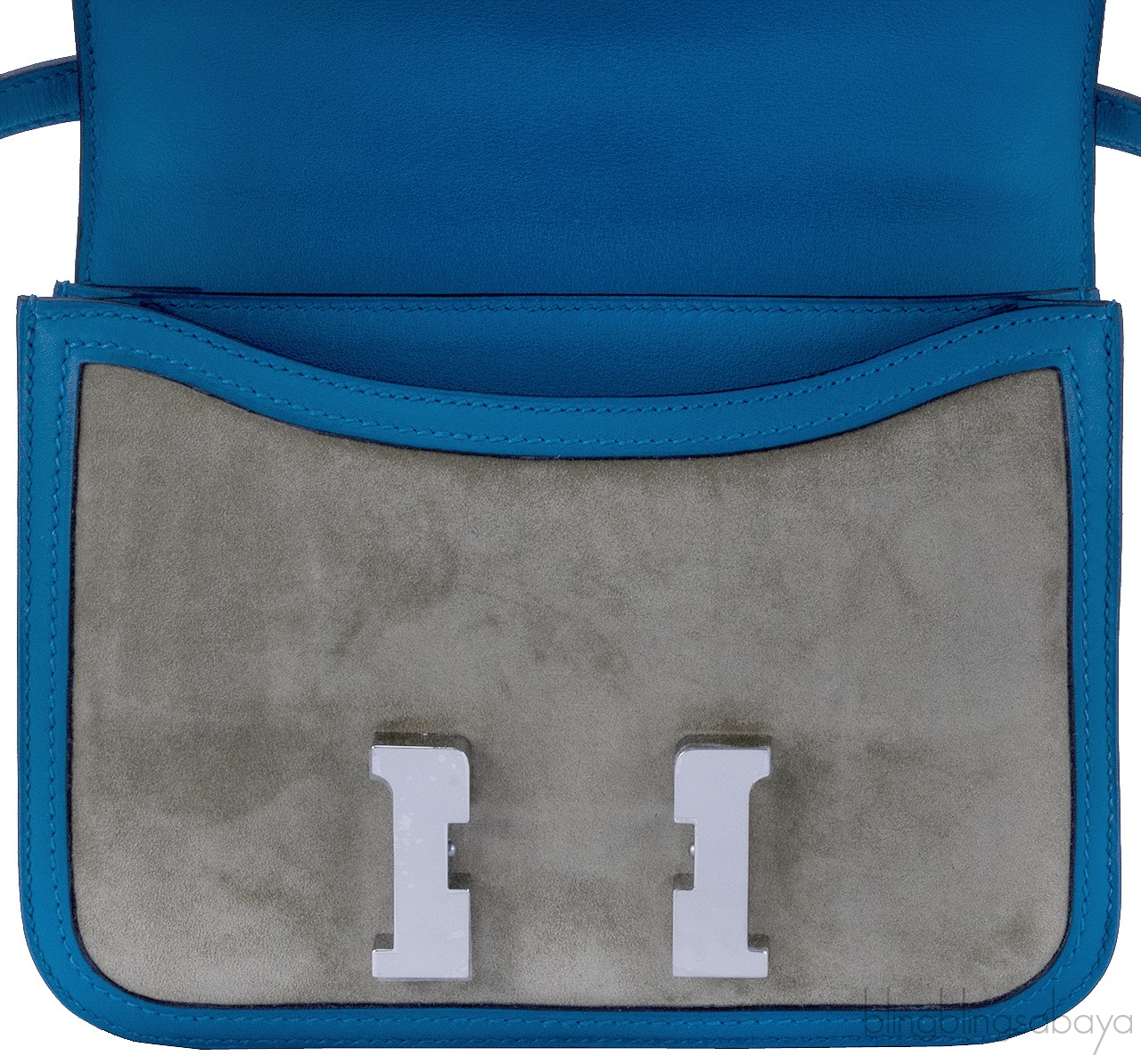 Another extra ordinary piece from the house of luxury is this stunning Constance III Mini Veau Doblis Shoulder Bag. This precious item is crafted in soft Suede Gris Tourterelle leather with Blue de Galice swift leather trimming. This stunning bag features a bold, iconic "H" on the front with a flap closure.