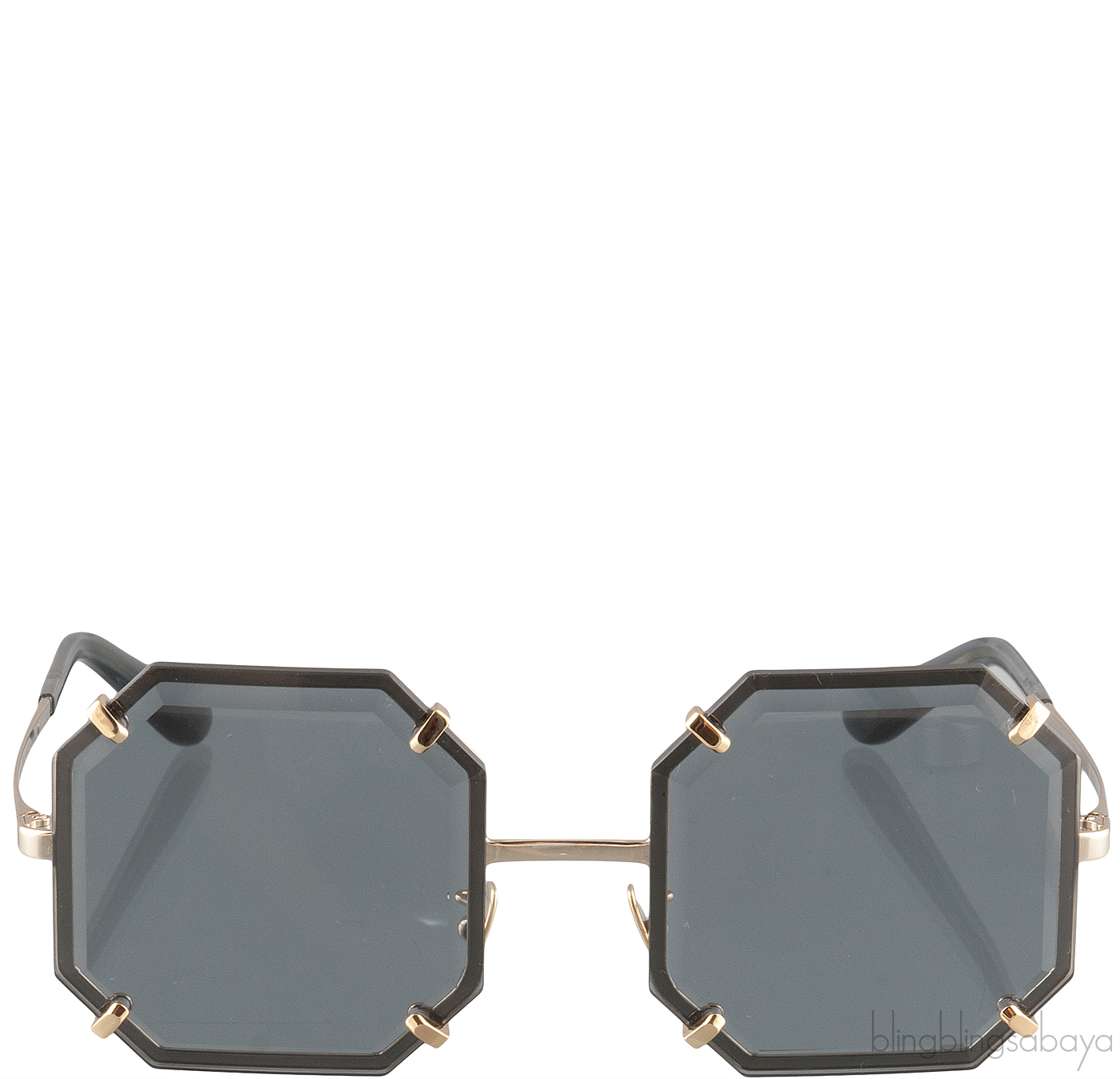 This Geometric DG 2216 Sunglasses from Dolce & Gabbana features a grey polycarbonate lens in geometric design with gold tone metal frame, nose pads, gold metal bridge, brand engrave on the side of the temple and light grey acetate edges.