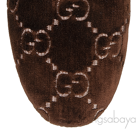 These GG Velvet Slippers from Gucci are crafted from GG logo velvet fabric upper with brown suede trim. This features a round almond toe, crystal embellished trim at vamp, satin insole and leather sole.
