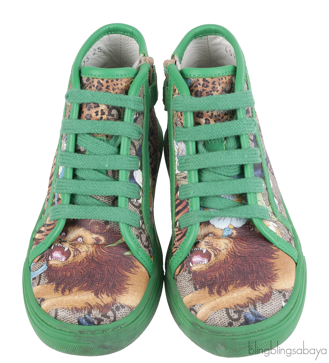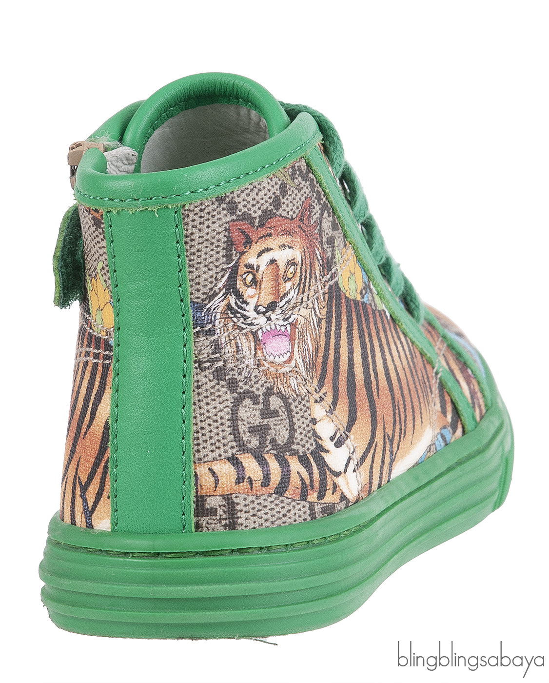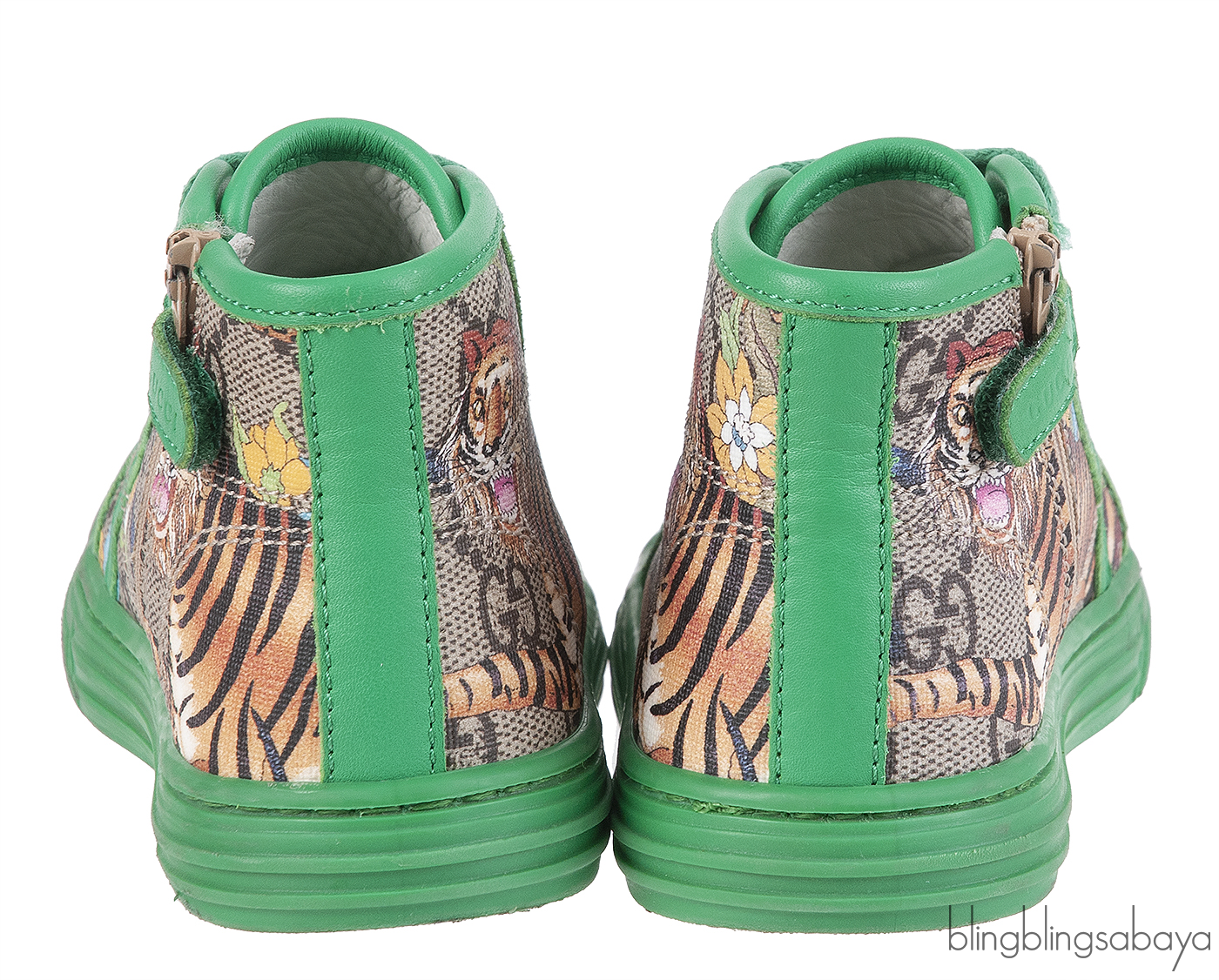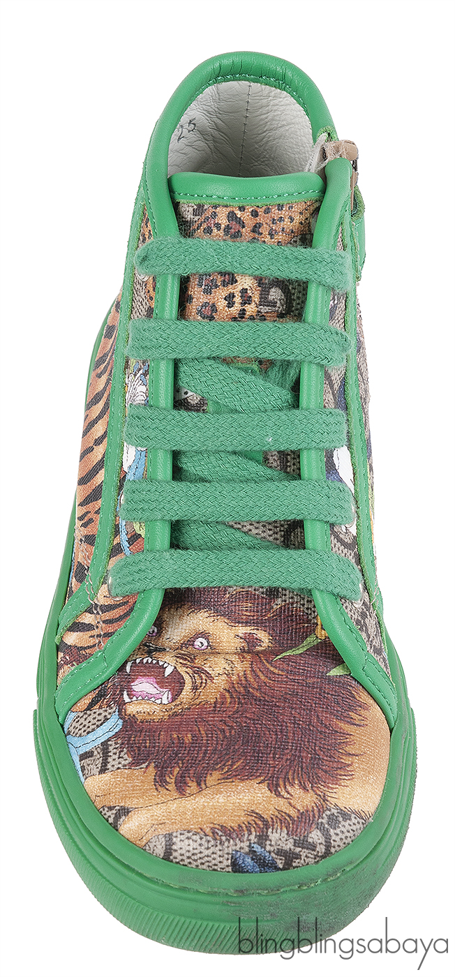 This pair of Gucci Green Safari Kids Sneakers is crafted from animal print safari motif upper with white leather lining. These sneakers features a contrasting green shoes laces, zip and velcro fastening on the side, leather insole and green rubber sole.